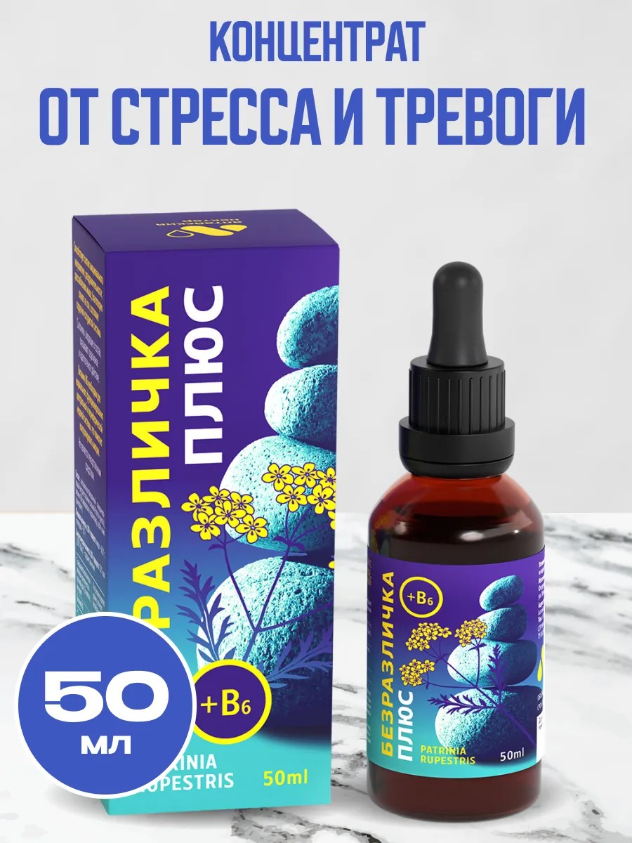 Концентрат «БЕЗРАЗЛИЧКА ПЛЮС» – натуральное успокоительное средство с витамином В6 и экстрактом патринии для борьбы со стрессом, тревожностью и бессонницей. Мягкие капли без привыкания снимают нервное напряжение, помогают расслабиться и улучшают качество сна, не являясь снотворным. Витамин В6 поддерживает работу нервной системы, участвуя в выработке серотонина, а мощный растительный экстракт патринии нормализует сердечный ритм и давление, превосходя по эффективности валериану. Удобная пипетка обеспечивает точную дозировку. Пищевая антистресс добавка подходит при неврозах, раздражительности, панических атаках, мигренях и хронической усталости. Успокаивающие капли для расслабления от нервов и тревоги. Натуральный состав без синтетических седативных веществ мягко восстанавливает эмоциональное равновесие и здоровый сон.