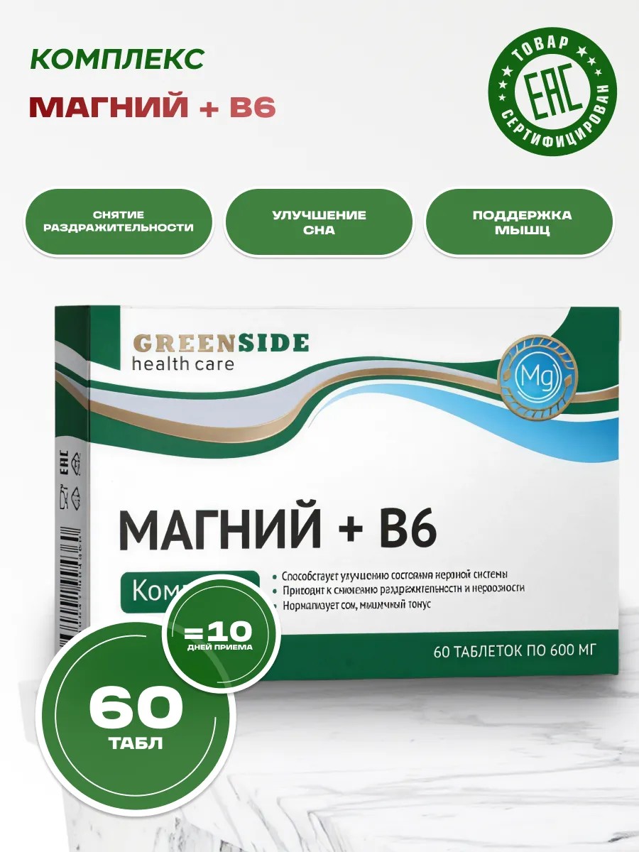 6 tablets contain: (Magnesium - 288 mg (72%); Vitamin B6 (pyridoxine hydrochloride) - 5.04 mg (252%))