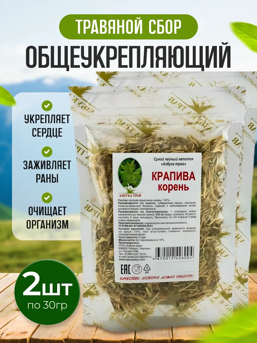 Stinging nettle root is used as a diuretic for dropsy, pulmonary tuberculosis, whooping cough, nephrolithiasis, gout, kidney disease, bladder disease, polyarthritis, anemia, and chorea in children. Nettle root is decocted and taken orally for helminthic infestations (worm ulcers on the intestinal mucosa), furunculosis, and hemorrhoids. Nettle root decoction is also useful as a cardiac remedy. In folk medicine, nettle root is effectively used to prevent prostatitis and prostate adenoma. Dosage: Pour 1 tablespoon of crushed roots into 300 ml of water, boil for 10 minutes, steep for 2 hours, and strain. Take 1/3 cup 3 times daily before meals. Contraindications: Individual intolerance. Directions: Pour 1 tablespoon of crushed roots into 300 ml of water, boil for 10 minutes, let steep for 2 hours, and strain. Take 1/3 cup 3 times daily before meals. This is not a medicine. Consult a doctor before use. Ingredients: Nettle root - 100%. Contents: 30 grams of dried, crushed nettle roots in individual packaging.