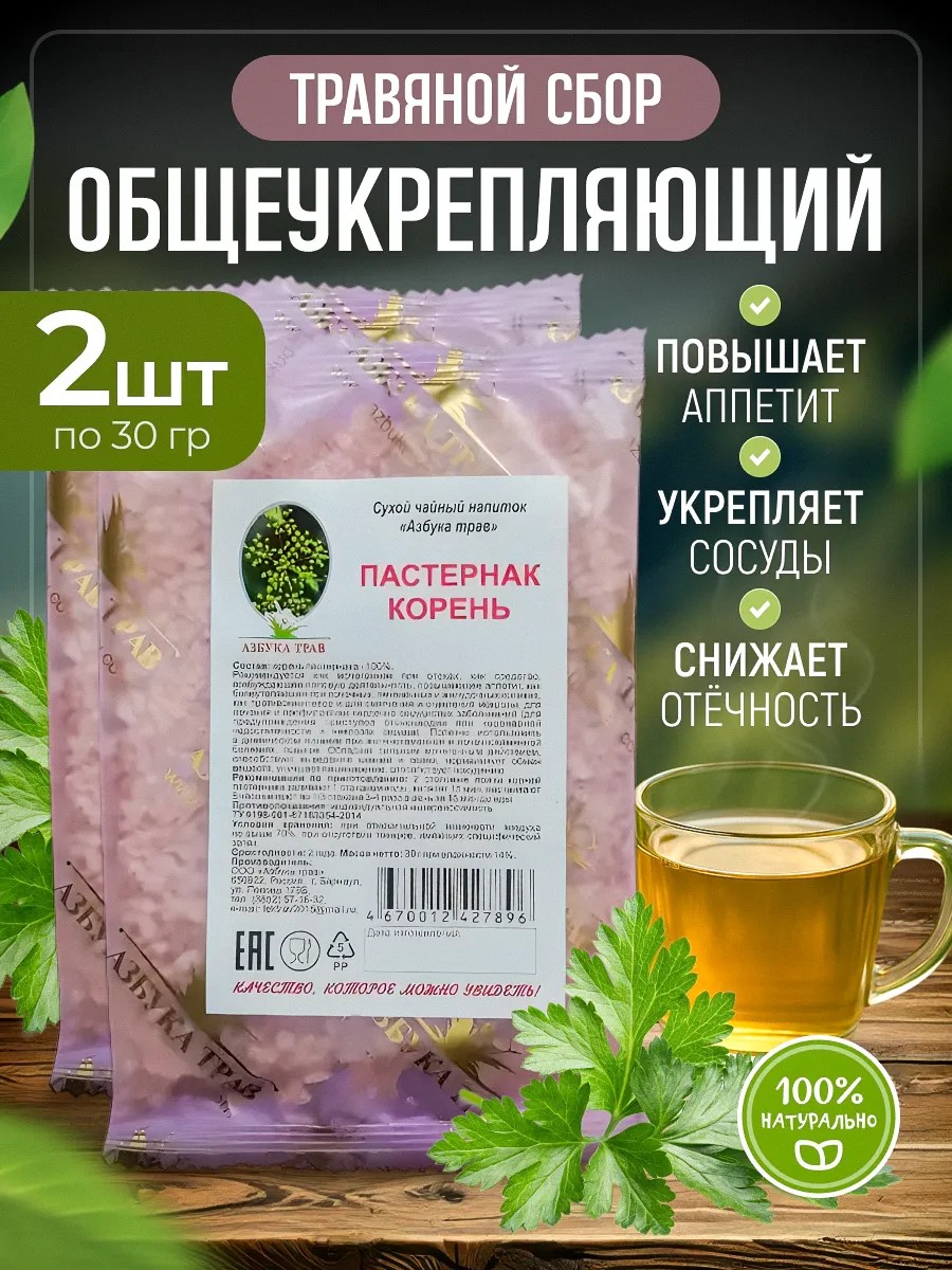 A preventative tea made from parsnip roots improves digestion, strengthens capillary walls, has analgesic and expectorant properties, and has tonic properties. Parsnip is used as a diuretic for edema, as a stimulant for sexual activity, as an appetite enhancer, as a pain reliever for renal, hepatic, and gastric colic, as an antitussive, and to soften and loosen mucus. In modern medicine, parsnip is used to treat and prevent cardiovascular diseases (to prevent angina attacks due to coronary insufficiency and cardiac neuroses accompanied by coronary spasms). Experimental studies have shown that parsnip furocoumarins increase skin sensitivity to ultraviolet rays, which promotes repigmentation of discolored areas of skin in people with vitiligo. Parsnip root is useful in dietary nutrition for gallstones, kidney stones, and gout. It has a strong diuretic effect, promotes the elimination of stones and salts, normalizes metabolism, improves digestion, and aids weight loss. A decoction of parsnip root gives strength and promotes recovery after serious illnesses. Dosage: Drink 1/3 cup 3-4 times daily 15 minutes before meals. Contraindications: Individual intolerance, kidney and liver failure, and pregnancy. Directions: Pour 1 cup of water over 2 tablespoons of parsnip root, boil for 15 minutes, steep for 8 hours, and drink 1/3 cup 3-4 times daily 15 minutes before meals. Not a medicine. Consult a physician before use. Ingredients: Parsnip root - 100% Contents: 30 grams of dried, crushed parsnip roots in individual packaging.