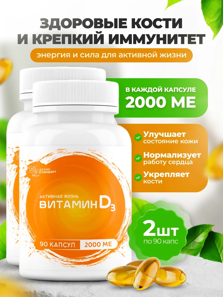 Витамин D3 2000 МЕ (50 мкг) в одной капсуле. Упаковка 90 капсул на 3 месяца ежедневного применения.Витамин D - гормон - регулирует обмен кальция и фосфора, обеспечивают нервно-мышечную проводимость, работу иммунной системы и деление клеток, препятствует отложению холестерина на стенках сосудов, снижает проявления аутоиммунных реакций.Согласно ряду клинических исследований, хронический дефицит витамина «D» у детей раннего возраста связан с высоким риском развития у них в будущем различных заболеваний: сахарного диабета, ожирения, аутоиммунных заболеваний, онкологических заболеваний, сердечно-сосудистых заболеваний, псориаза, атопических заболеваний, воспалительных заболеваний кишечника.Формой витамина D, которая оказывает воздействие на клетки (биологически активной) является кальцитриол, который образуется в печени и почках из своих неактивных (биологически инертных) предшественников (холекальциферол и эргокальциферол). Холекальциферол в основном вырабатывается в коже под действием солнечных лучей, с пищей он поступает в меньших количествах.Обеспеченность организма витамином D определяют по его предшественнику кальцидиола — 25(ОН) витамина D, концентрацию которого и определяют в крови.Дефицит витамина D определяется как концентрация 25(ОН) витамина D в крови менее 20 нг/мл (менее 50 нмоль/л), недостаточность — при концентрации от 20 до 30 нг/мл (от 50 до 75 нмоль/л). Данные уровни применимы как ко взрослым, так и к детям.Дефицит витамина D во всём мире наблюдается примерно у 1 млрд человек. Симптомы дефицита витамина Д: •снижение физической выносливости, общая слабость даже при достаточном объёме сна; •мышечная слабость, особенно в области шеи, плечевого и тазoвого пояса, бедра, лопаточной области; •спазмы в мышцах; •боли в суставах; •диффузные боли в мышцах; •нарушение равновесия; •хроническая боль; •плохая концентрация внимания; •головные боли; •перепады настроения, беспокойство или депрессия;•нарушения сна (неполноценный беспокойный сон);•повышенная потливость;•повышенное артериальное давление;•набор веса;•сухость кожи;•выпадение волос;•частые простудные заболевания;•плохое заживление ран и другие.