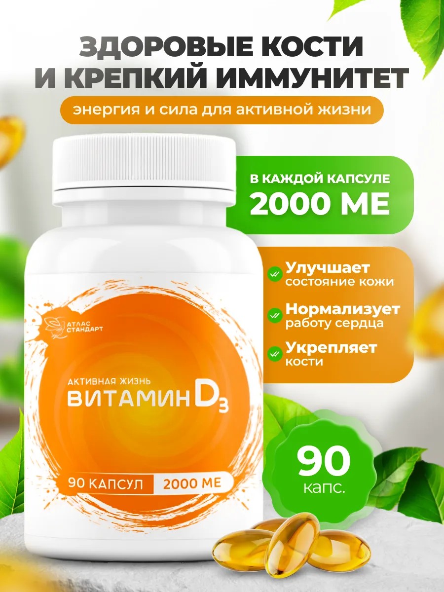 Витамин D3 2000 МЕ (50 мкг) в одной капсуле. Упаковка 90 капсул на 3 месяца ежедневного применения.Витамин D - гормон - регулирует обмен кальция и фосфора, обеспечивают нервно-мышечную проводимость, работу иммунной системы и деление клеток, препятствует отложению холестерина на стенках сосудов, снижает проявления аутоиммунных реакций.Согласно ряду клинических исследований, хронический дефицит витамина «D» у детей раннего возраста связан с высоким риском развития у них в будущем различных заболеваний: сахарного диабета, ожирения, аутоиммунных заболеваний, онкологических заболеваний, сердечно-сосудистых заболеваний, псориаза, атопических заболеваний, воспалительных заболеваний кишечника.Формой витамина D, которая оказывает воздействие на клетки (биологически активной) является кальцитриол, который образуется в печени и почках из своих неактивных (биологически инертных) предшественников (холекальциферол и эргокальциферол). Холекальциферол в основном вырабатывается в коже под действием солнечных лучей, с пищей он поступает в меньших количествах.Обеспеченность организма витамином D определяют по его предшественнику кальцидиола — 25(ОН) витамина D, концентрацию которого и определяют в крови.Дефицит витамина D определяется как концентрация 25(ОН) витамина D в крови менее 20 нг/мл (менее 50 нмоль/л), недостаточность — при концентрации от 20 до 30 нг/мл (от 50 до 75 нмоль/л). Данные уровни применимы как ко взрослым, так и к детям.Дефицит витамина D во всём мире наблюдается примерно у 1 млрд человек. Симптомы дефицита витамина Д: •снижение физической выносливости, общая слабость даже при достаточном объёме сна; •мышечная слабость, особенно в области шеи, плечевого и тазoвого пояса, бедра, лопаточной области; •спазмы в мышцах; •боли в суставах; •диффузные боли в мышцах; •нарушение равновесия; •хроническая боль; •плохая концентрация внимания; •головные боли; •перепады настроения, беспокойство или депрессия;•нарушения сна (неполноценный беспокойный сон);•повышенная потливость;•повышенное артериальное давление;•набор веса;•сухость кожи;•выпадение волос;•частые простудные заболевания;•плохое заживление ран и другие.