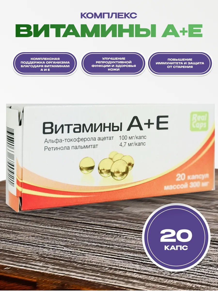 Витамины А + Е RealCaps 20 капс. 300 мг. 60 Pекомендуется в качестве дополнительного источника витаминов А и Е. Действие АЕВИТа определяется свойствами входящих в его Ретинола пальмитат (витамин А) - жирорастворимый витамин, играет важную роль в окислительно-восстановительных процессах, участвует в синтезе сложных углеводов, белков и жиров. Он необходим для нормальной репродуктивной функции, эмбрионального развития, обновления клеток кожи и слизистых оболочек и образования костной ткани. Участвует в механизме зрения. Ретинол повышает иммунитет, ослабляет последствия ряда инфекционных заболеваний, может препятствовать развитию злокачественных новообразований. Альфа-токоферола ацетат (витамин Е) препятствует разрушению клеточных оболочек, участвует в синтезе белков, процессах деления клеток, тканевом дыхании, благоприятно влияет на нарушенный жировой обмен. Витамин Е поддерживает стабильность красных кровяных телец и предупреждает их распад, препятствует повышенной проницаемости и ломкости капилляров, повышает устойчивость тканей к недостатку кислород. Витамин Е также способствует восстановлению скелетных мышц при мышечной дистрофии и других поражениях мышц. При сердечно-сосудистых заболеваниях в комплексной терапии витамин Е способствует нормализации обмена веществ в сердечной мышце, повышает скорость кровотока и поддерживает напряжение в мелких сосудах. Витамин Е также способствует нормализации функции половых желез у мужчин.1 капсула содержит: альфа-токоферола ацетата - 100 мг (100 МЕ), ретинола пальмитата - 4,7 мг (8000 МЕ). Рекомендации по применению: взрослым по 1 капсуле в день во время еды. Продолжительность приёма - 2-4 недели. При необходимости прием можно повторить через месяц. Перед применением рекомендуется проконсультироваться с врачом. Не является лекарством.Противопоказания: индивидуальная непереносимость компонентов, беременность, кормление грудью.Условия реализации: через аптечную сеть и специализированные магазины, отделы торговой сети.Данная продукция не является лекарственным средством В нашем магазине Вы найдете отличные подарки на любой повод и праздник: день рождения близких людей - для жены, мужа, брата, сестры, папе. 14 февраля любимой девушке, женщине. 23 февраля мужчине. На 8 марта. На новый год для взрослых, юношей, детей. На выпускной другу, подруге. На день матери. Также имеются семейные товары: маме, отцу, для ребенка, для сына, дочке. Вы сможете дополнить как основной подарок, так и создать вкусный и полезный, оригинальный подарочный набор, зож бокс или комплект из представленных товаров, преподнеся его в красивой упаковке. На странице нашего магазина всегда можно найти распродажи, акции и скидки.