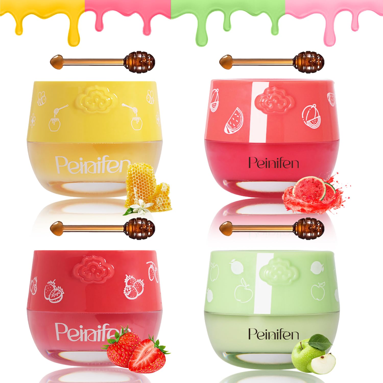 Delicious 4-Flavor Gift Set Enjoy a choice of naturally inspired flavors: Honey, Strawberry, Watermelon, and Apple Lime. This beautifully packaged set is a delightful and thoughtful gift for friends, family, or yourself. Cute Honey Pot Design with Hygienic Applicator Each balm comes in an adorable, portable honey pot. The included silicone applicator stick ensures clean, precise, and mess-free application, making lip care both fun and convenient. Propolis Vitamin E for Healthy Lips The blend of nourishing Propolis and antioxidant Vitamin E helps to condition the delicate lip skin, support natural repair, and smooth the appearance of fine lines for visibly healthier, plumper-looking lips. Versatile Day Night Formula Use it as a lightweight daily hydrating balm for protection, or as a rich overnight sleeping mask for intensive repair. One product perfectly adapts to all your lip care needs, ensuring lips stay supple around the clock. 24-Hour Intensive Moisturizing Care Provides deep, long-lasting hydration anytime. Enriched with Propolis and Vitamin E, this balm intensely moisturizes to soothe severe dryness, repair chapped lips, and prevent moisture loss day and night.