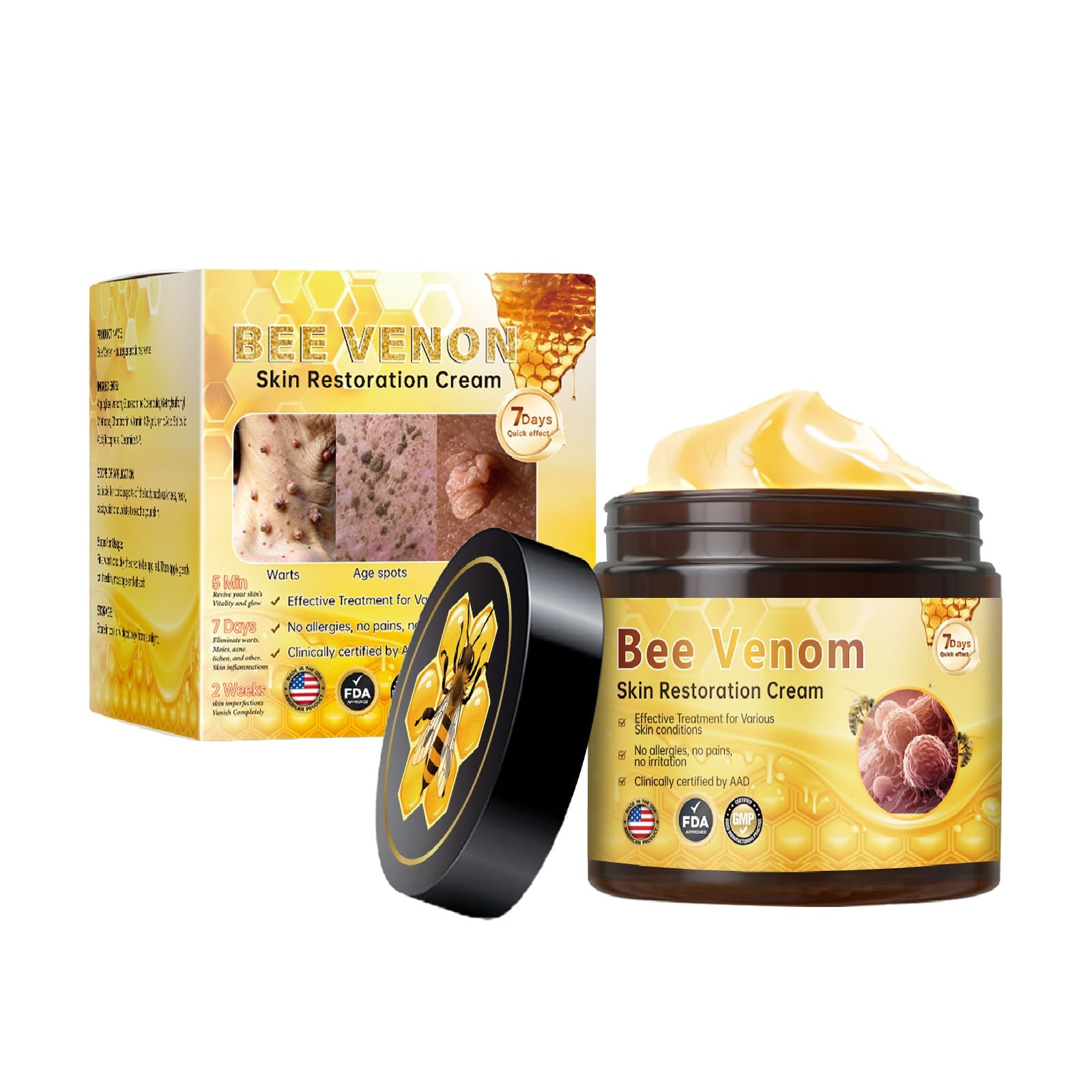 Bee venom skin restoration cream,effective reduce the appearance of scars, wrinkles and blemishes, restore smooth skin more radiant. Enriched with bee venom vitamin k12 and hyaluronic acid natural ingredients,gentle and non-irritating. Deep penetrates skin,nourishes firm sagging skin treatment comprehensive cream, for all skin. Natural plant serum moisturizing dry skin,plump and elastic,making the skin healthier and soft, gloss. Take an appropriate amount of evenly apply it to the skin.gently massage in circles with until absorbed.
