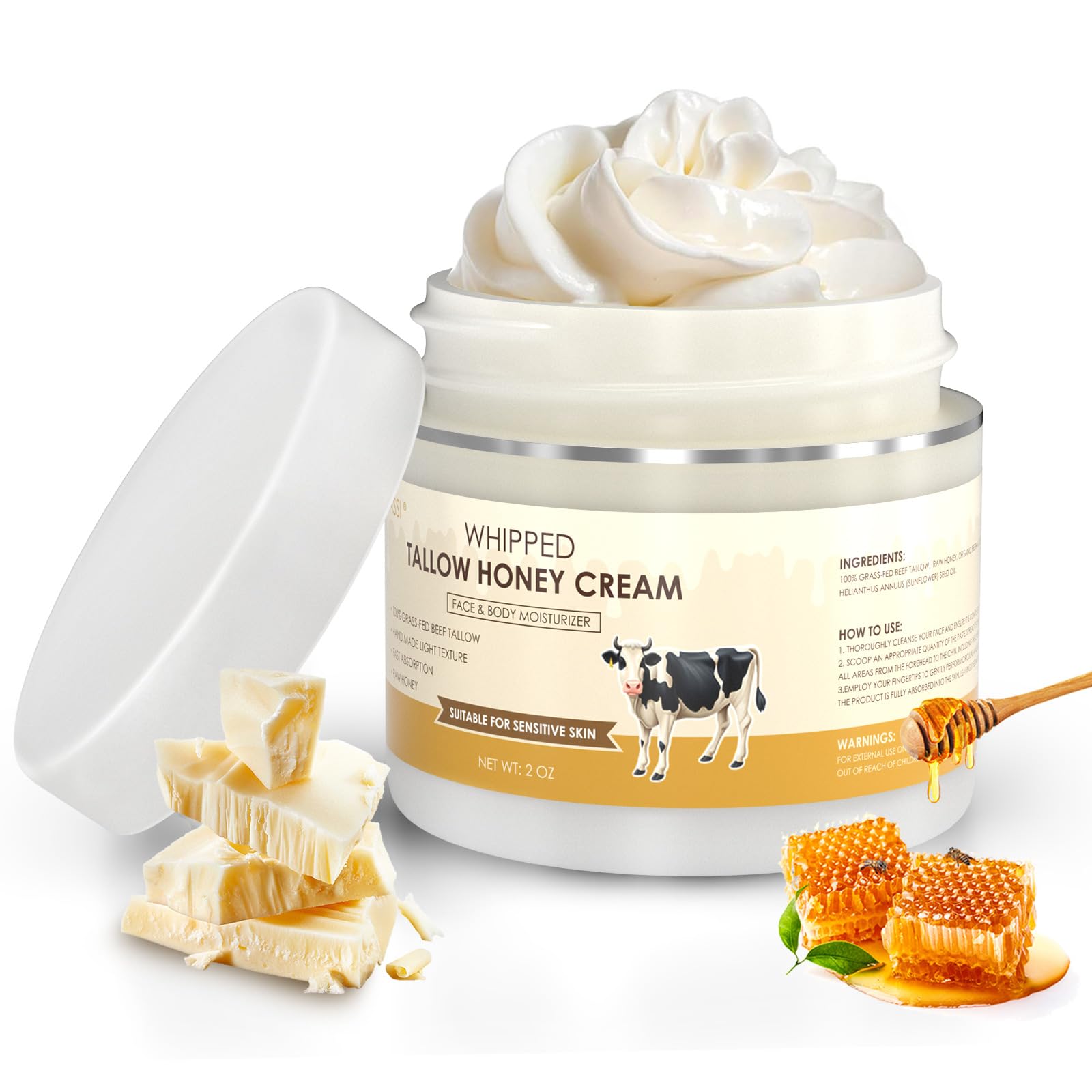 CONVENIENT SIZE: 2-ounce jar of concentrated moisturizer that's perfect for daily use and travel. WHIPPED TEXTURE: Light and easily absorbed consistency that spreads smoothly without leaving a greasy residue. UNSCENTED FORMULA: Pure and natural whipped tallow cream without added fragrances, ideal for those with sensitivities. VERSATILE USE: Suitable as both facial cream and body moisturizer, perfect for all skin types including sensitive skin. NATURAL INGREDIENTS: Crafted with grass-fed beef tallow and organic honey, providing essential nutrients and moisture for your skin.
