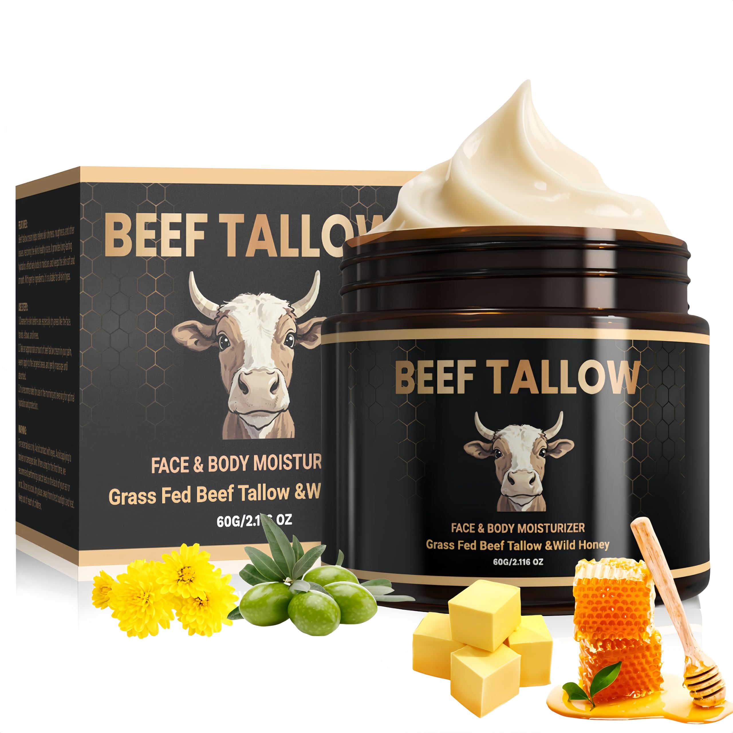 Usage Method: Beef tallow simply take a small amount of our Whipped Beef Tallow and Honey Balm and gently massage it onto the desired area until fully absorbed. Your skin will feel smooth, supple, and delicately scented. Mild and Safe Composition: Tallow and honey balm made with gentle and safe ingredients like beef tallow, honey, and olive oil, this balm deeply moisturizes and hydrates the body and face, leaving the skin firm and nourished. Beef Tallow and Honey Balm: Beef tallow and honey balm Infused with grass-fed butter, honey, nourished by a natural diet. Nourish your skin, improve dry, rough skin, skin 0 burden, sensitive skin can also be used with confidence. Mother Nature's Ultimate Moisturizer: Our whipped tallow is filled to the brim with skin-loving ingredients that will nourish your skin. Use this cream as a face moisturizer, body lotion, or lip balm. Beef tallow balm achieve a full-body hydration and nourishment. Suitable for dry, oily, and variety skin. Face and Body Skin Care: This tallow face moisturizer infused with grass-fed beef tallow and honey, this lotion is rich in vitamins, offering superior nourishment for your skin. Providing the necessary moisture and nourishment for your skin, leaving it hydrated and radiant.