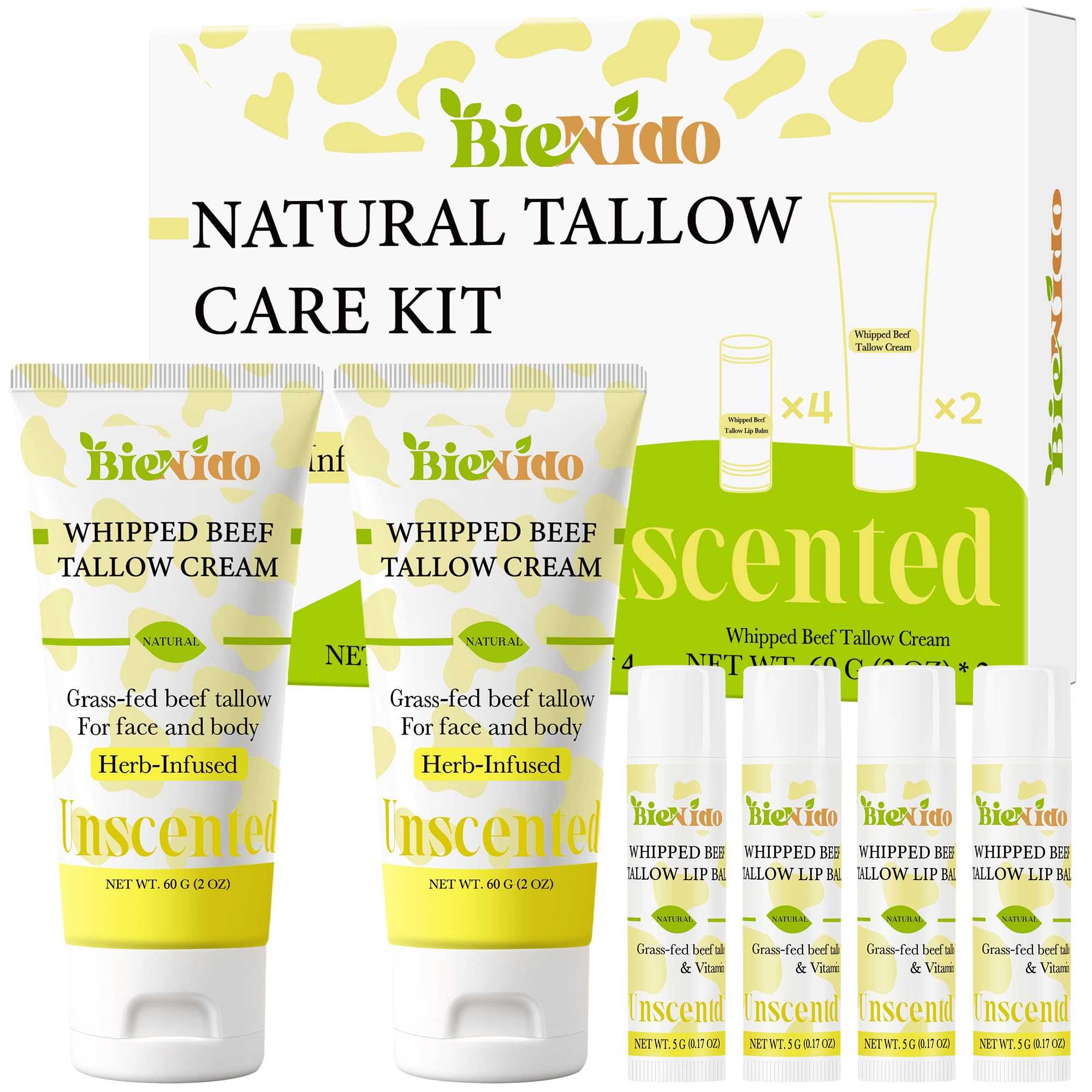 Beef Tallow for Skin: Organic Grass Fed Tallow Cream & Lip Balm Set Natural Dry Skin Moisturizer for Face Body & Lips 2 Ounce (Pack of 2)
