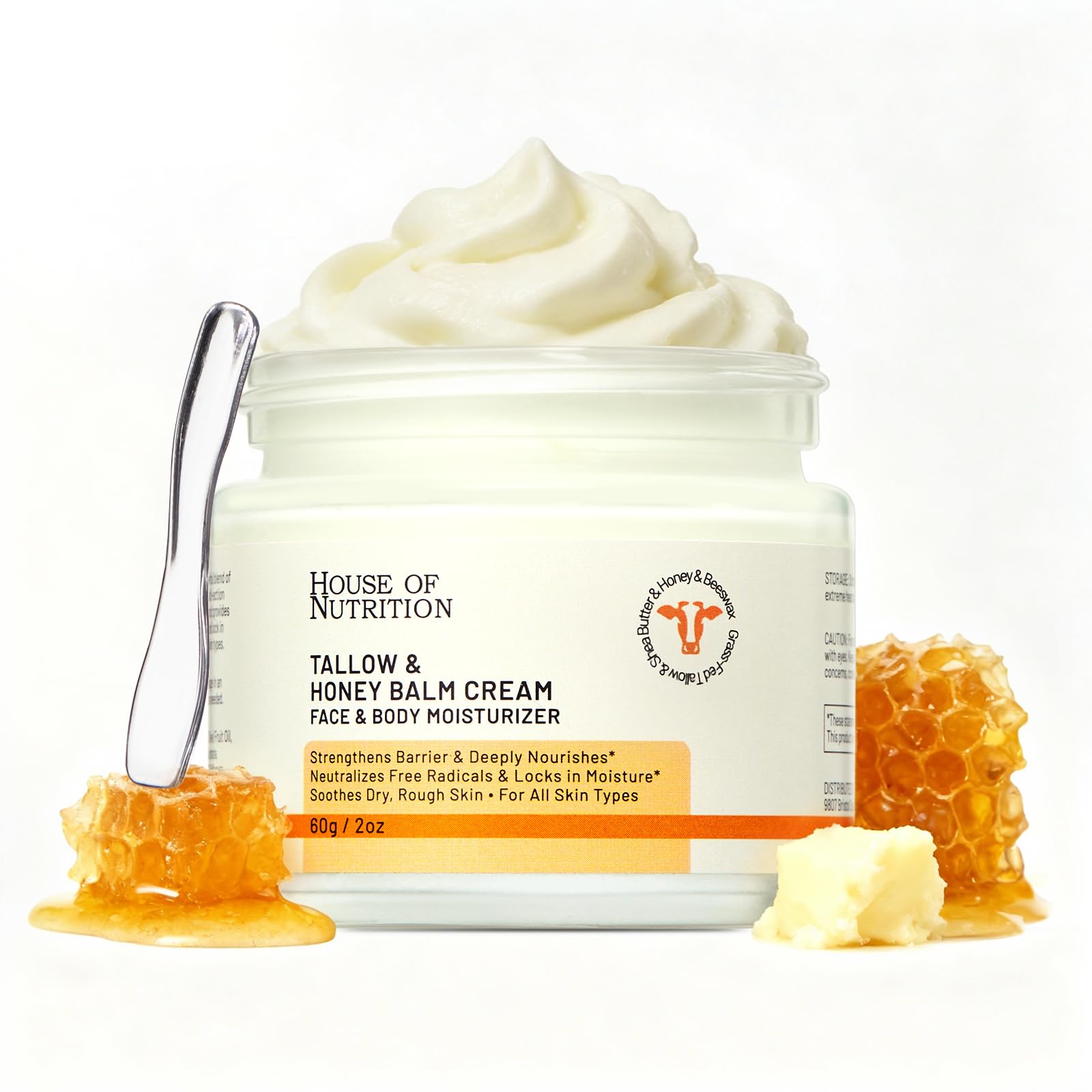 Beef Tallow for Skin, Tallow and Honey Balm, 100% Grass Fed Whipped Moisturizer, Natural Honey & Beeswax Cream, Face and Body Skincare, Deep Hydration for Sensitive Skin, Non-Greasy, 2oz