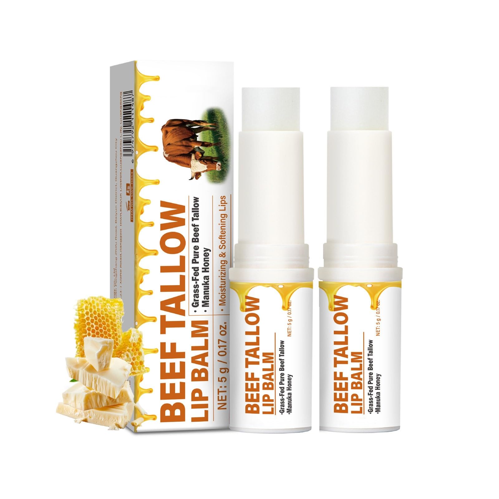 Beef Tallow Lip Balm Natural Grass Fed Beef Tallow & Honey Chapstick Rich Vitamins Long Lasting Hydrating & Nourishing Tallow Balm Lip Care Soothes Chapped Dry Sensitive Lips - 2 Pack