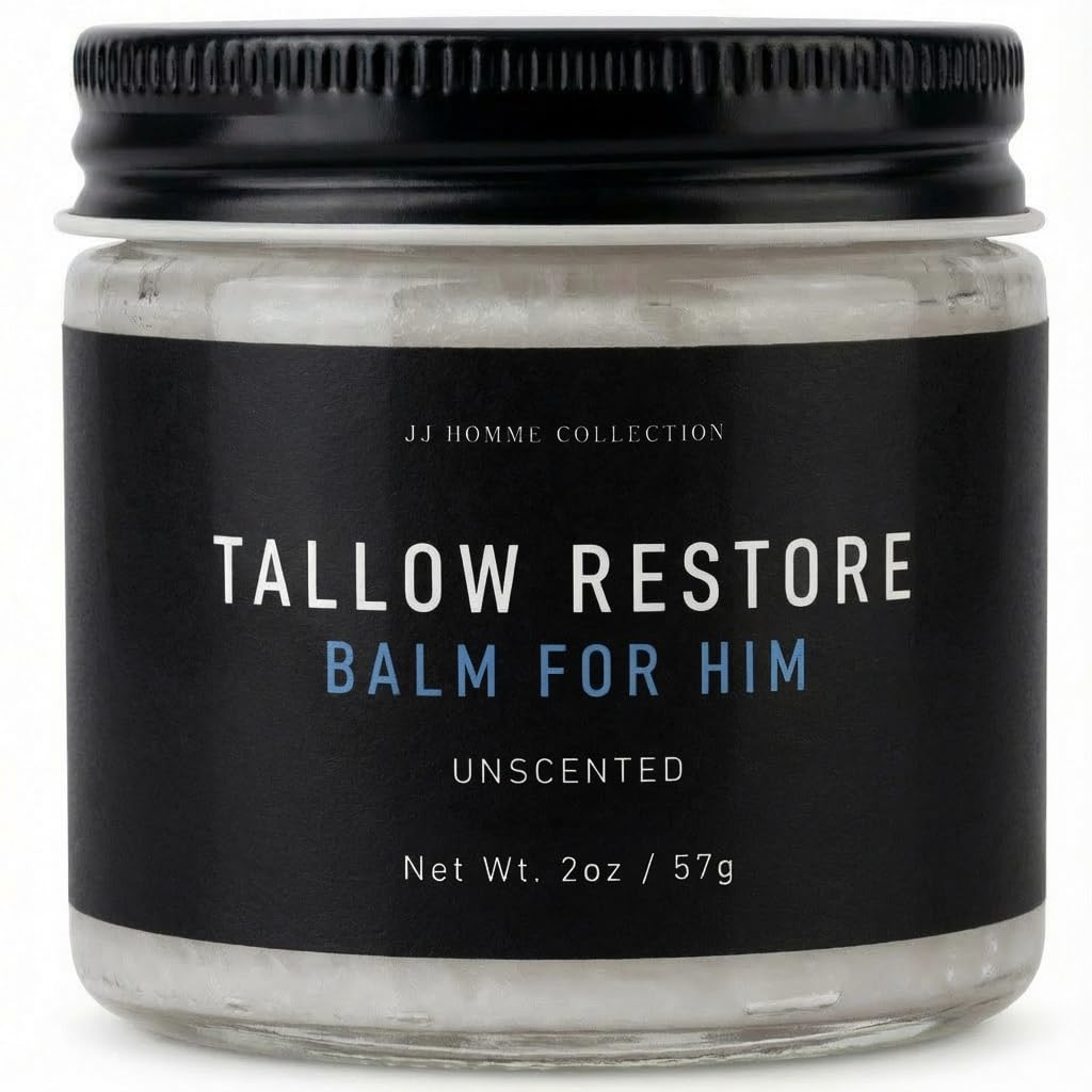 Built for men's skin—thicker, oilier, and more prone to irritation from shaving and daily exposure. Our Grass-Fed Tallow Balm for Men is a rich yet fast-absorbing moisturizer made with 100 pasture-raised beef tallow, raw honey, jojoba oil, and organic botanical oils to deeply nourish, calm irritation, and strengthen the skin barrier without heaviness. Tallow closely mirrors the skin's natural lipids, allowing it to absorb efficiently while helping regulate oil production and prevent moisture loss. The result is balanced, resilient skin that stays hydrated all day—never greasy, sticky, or pore-clogging. Ideal for dry or rough skin, post-shave irritation, acne-prone skin, eczema-prone skin, or men dealing with a compromised moisture barrier. Use it as a daily face moisturizer, post-shave balm, nighttime repair cream, under-eye treatment, or full-body hydrator. Handcrafted in small batches in the USA and third-party tested for quality and purity, this is a clean, minimal-ingredient solution designed to perform—without fillers, fragrances, or unnecessary extras.CLEAN, HANDMADE TESTED: Small-batch crafted in the USA with minimal, all-natural ingredients. No fillers, seed oils, or synthetic fragrance. Regularly third-party tested for safety, purity, and quality. LIGHTWEIGHT, NON-GREASY FINISH: Whipped to a smooth, cloud-like texture that melts instantly into thicker men's skin—hydrating deeply without clogged pores or heaviness. BALANCES OIL STRENGTHENS BARRIER: Supports a healthier moisture barrier while helping regulate excess oil production—ideal for men prone to breakouts, dryness, or rough texture. SOOTHES REPAIRS POST-SHAVE SKIN: Raw honey and jojoba oil help calm razor irritation, reduce redness, and support healing for smoother, stronger skin after shaving. WHY TALLOW FOR MEN: Made with 100 grass-fed beef tallow that naturally mimics men's skin oils for faster absorption, better oil balance, and long-lasting hydration—without shine or residue.