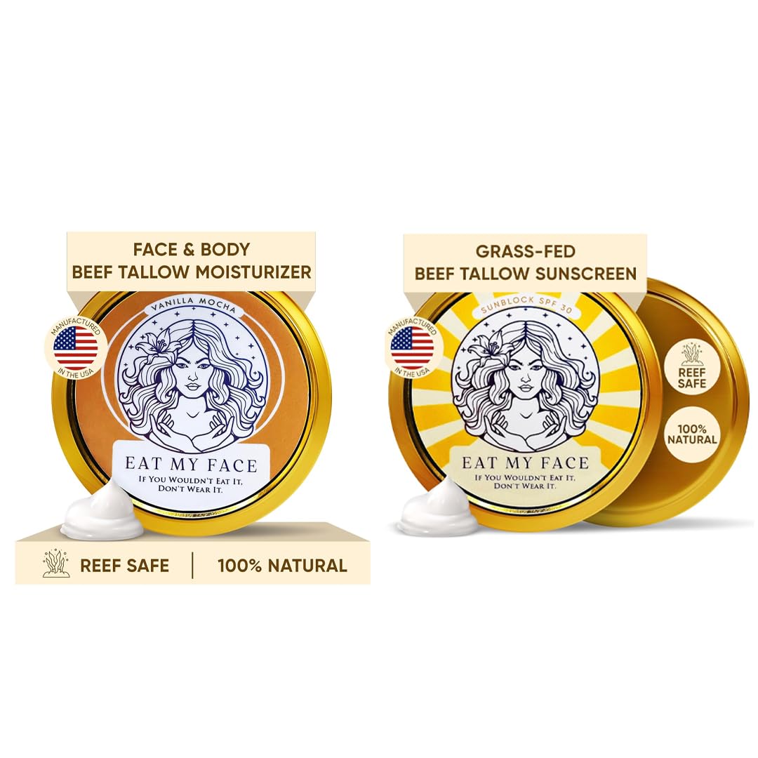 Embrace the sunshine guilt-free with 'Eat My Face' beef tallow sunscreen, SPF 30 Reef Safe sunscreen. Our beef tallow sunscreen is a pledge to protect both your skin and our oceans , featuring non-nano zinc oxide for broad-spectrum coverage that's kind to marine life. Infused with the finest organic ingredients like grass-fed tallow, shea butter, and cocoa butter, our formula is a feast for your skin, providing nourishment while shielding you from the sun's rays. With our 'if you wouldn't eat it, don't wear it' philosophy, you can step outside knowing you're covered in the safest, most natural way. Dive in and play with peace of mind, knowing you're helping to preserve the beauty beneath the waves .ALL NATURAL SUNSCREEN WITH VANILLA SCENT: Experience the smooth, non-greasy application of our beef tallow sunscreen. Enhanced with natural vanilla scent, this reef safe sunscreen spf 30 is ideal for daily use, whether you're lounging by the pool, taking a hike, or simply on the go. Safe and effective, this all natural sunscreen without chemicals it's designed to keep your skin nourished and shielded throughout your day. Embrace natural care with Eat My Face beef tallow sunscreen!. ANTI-AGING BENEFITS WITH NATURAL INGREDIENTS: Packed with antioxidants like vitamin E and sea buckthorn, our beef tallow moisturizer face and body supports healthy, youthful skin. This tallow face cream helps reduce signs of aging, protecting your skin from environmental damage and promoting a natural glow. The inclusion of organic beef tallow for face makes this tallow cream a wise choice in tallow skin care routines for long-lasting beauty. 100 REEF SAFE SUNSCREEN TRAVEL SIZE: Our portable biodegradable sunscreen reef safe is responsibly made to be an eco friendly sunscreen, an all natural sunscreen without chemicals that harms marine life. Eat My Face beef tallow sunscreen for face is a non nano zinc oxide sunscreen and tallow based sunscreen that not only shields your skin but also preserves the environment, making it a true reef friendly sunscreen and natural face sunscreen choice for conscious consumers. DEEPLY HYDRATING FORMULA: Our tallow face moisturizer combines the rich nourishment of beef tallow for face with shea and cocoa butter for deep hydration. This beef tallow face cream provides lasting moisture, ideal for beef tallow skin care on dry and sensitive skin. Gentle yet effective, this tallow cream works for all skin types. Ensure your skin stays soft, smooth, and radiant without greasy residue with our tallow face moisturizer. OOOPS! Some labels might say SPF 20, but don't worry—our sunscreen is actually SPF 30. Same formula, same protection, just a little typo keeping things interesting! BEEF TALLOW SUNSCREEN SPF 30 WITH NON NANO ZINC OXIDE SUNSCREEN: Shield your skin with Eat My Face tallow sunscreen. Reliable for daily use, Eat My Face reef safe sunscreen spf 30 is a reef friendly sunscreen and a non nano zinc oxide sunscreen providing maximum protection against UVA and UVB rays.