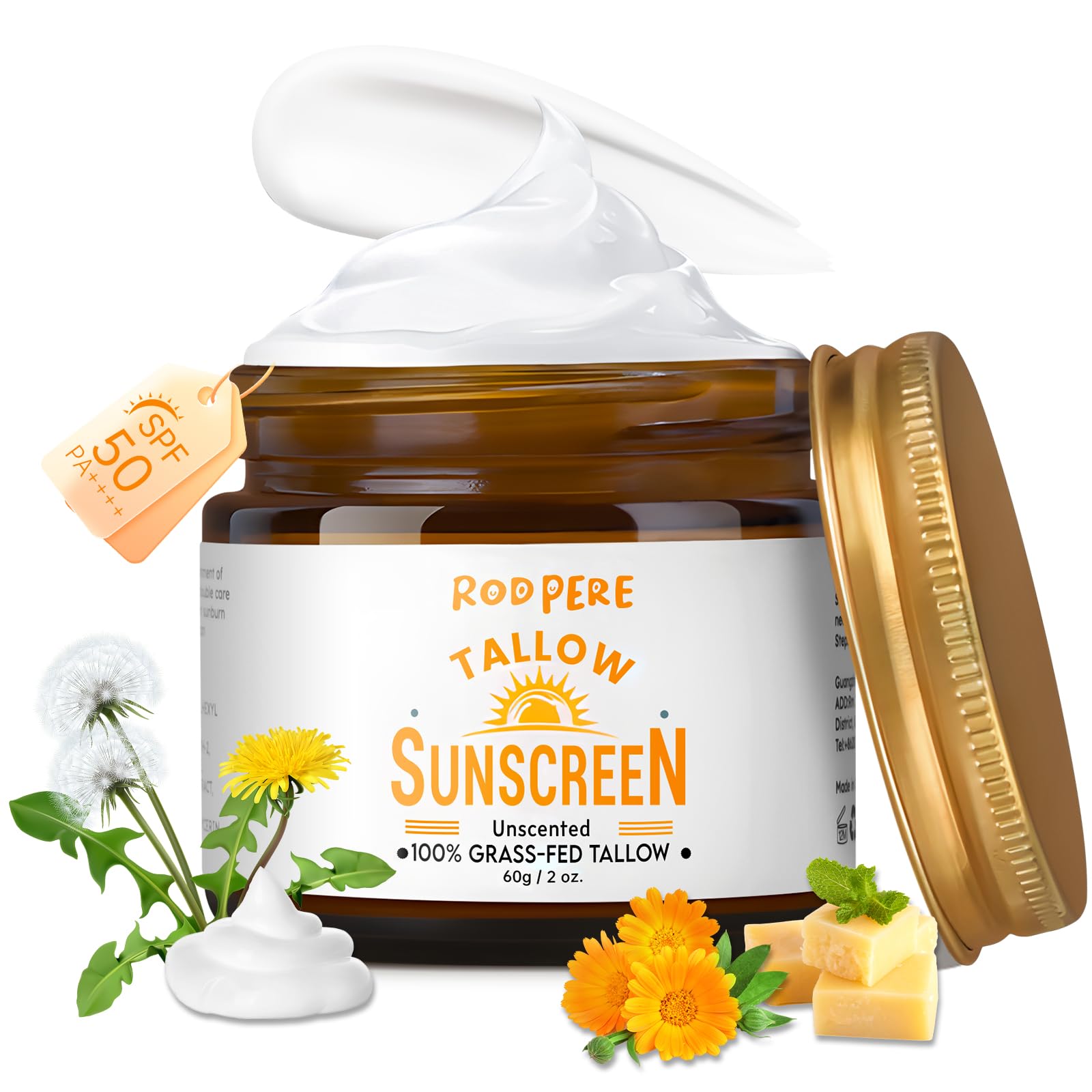 REEF SAFE FAMILY FRIENDLY: We focus on sun protection and repair of the skin, using a mild plant-based formula that is free of alcohol and other chemicals, fragrances. Reusable packaging materials, ensure reef safe. Non toxic sunscreen fully meets the sun protection needs of the whole family from the face to the whole body, and is also suitable for kids, pregnant women and girls. SUITABLE FOR ALL SKIN TYPES, USE BEFORE MAKEUP: Tallow has a natural skin friendly characteristic, combined with a mild plant-based formula, quickly forming a protective film for the skin, deeply nourishing the skin, not false white, suitable for use before makeup, suitable for all skin types. Keeping the skin fresh and moisturizing, suitable for sensitive skin and baby skin. WATERPROOF SWEATPROOF FOR 80 MINUTES: Tallow sunblock has the ability to provide long-lasting sun protection. Through waterproof and sweatproof testing, the sunscreen can adhere to the skin during swimming and high-intensity outdoor activities, nourishing the skin. Waterproof and sweatproof for up to 80 minutes, reducing the frequency of repeated applications, leaving no white residue and not greasy. NATURAL GRASS-FED TALLOW MULTIPLE PLANT FORMULAS: We focus on efficient sun protection and pay more attention to deep nourishing of the skin. Using food grade tallow as the core ingredient, rich in vitamins A, D, E and minerals, combined with plants such as hyaluronic acid, dandelion and marigold, repair damaged skin, provide long-lasting hydration. Unlike traditional sunscreen, it is lighter, more breathable and does not clog pores. BROAD SPECTRUM SPF 50 SUNSCREEN: Using high magnification physical broad-spectrum sunscreen technology, 100 grass-fed tallow non nano zinc oxide form a natural protective barrier, which can effectively block 98 of UVA and UVB, providing up to 500 minutes of sun protection for the skin, preventing sunburn and skin aging. It is a good choice for outdoor activities and beach camping.