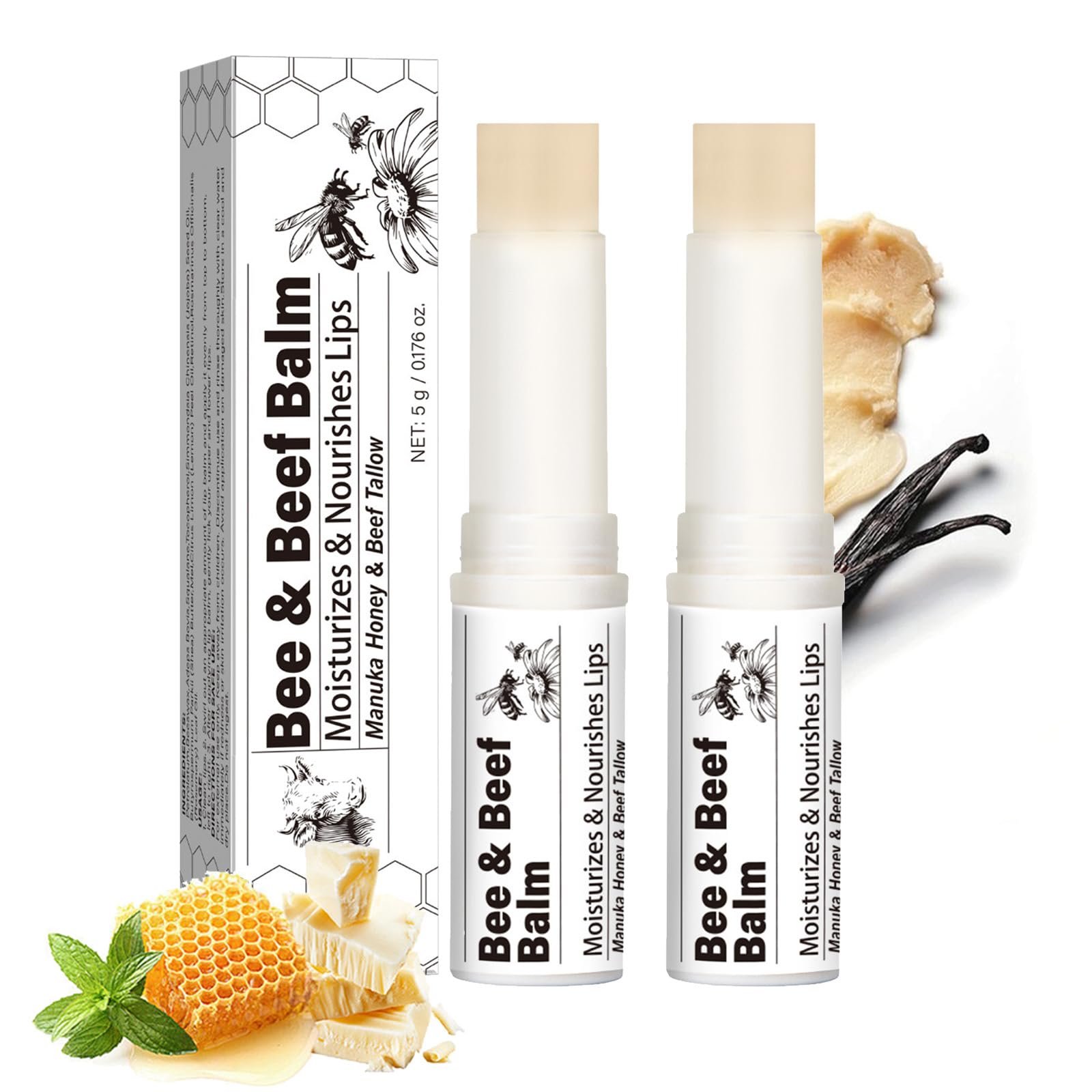 ? FEATURES BENEFITS: Relieves Dry, Cracked, Or Chapped Lips Improves Lip Tone And Fine Lines With Regular Use Smooth, Non-Greasy Formula Ideal For Layering Under Lipstick Suitable For All Skin Types, Including Sensitive Lips Compact And Portable For Anytime Use Name: Bee Beef Tallow Lip Balm 2 pcs Net: 5g 0.176 oz 2pcs Shelf life: 3 Years Effect: Moisturizes and nourishes lips,leaving them soft and shiny.SUITABLE FOR ALL SKIN TYPES :Whether your lips are dry, sensitive, or normal, our Bee Tallow Lip Balm is perfect for you. It is gentle yet effective, making it an essential item for your lip care routine. Apply before lipstick for a flawless lip makeup look. PORTABLE SIZE : This moisturizing lip balm is compact and portable, easily fitting into your pocket, handbag, makeup bag, or desk drawer. Whether you're at work, out and about, or traveling, soothing lip care is always within reach. REDUCE LIP LINES : Regular use of this organic beef tallow lip balm can significantly reduce fine lines and dryness, gently exfoliate the lips, enhance your natural lip color, restore luster, and make your lips fuller and healthier. SOFT AND SMOOTH : This beef tallow lip balm has a smooth texture that provides long-lasting moisture, locks in hydration, alleviates pain caused by chapped lips, and keeps your lips moisturized. DEEP MOISTURIZING AND NOURISHING : Enriched with organic grass-fed beef tallow, this lip balm effectively repairs the lip barrier, deeply moisturizes, and protects delicate lip skin, keeping your lips soft and healthy all day long.