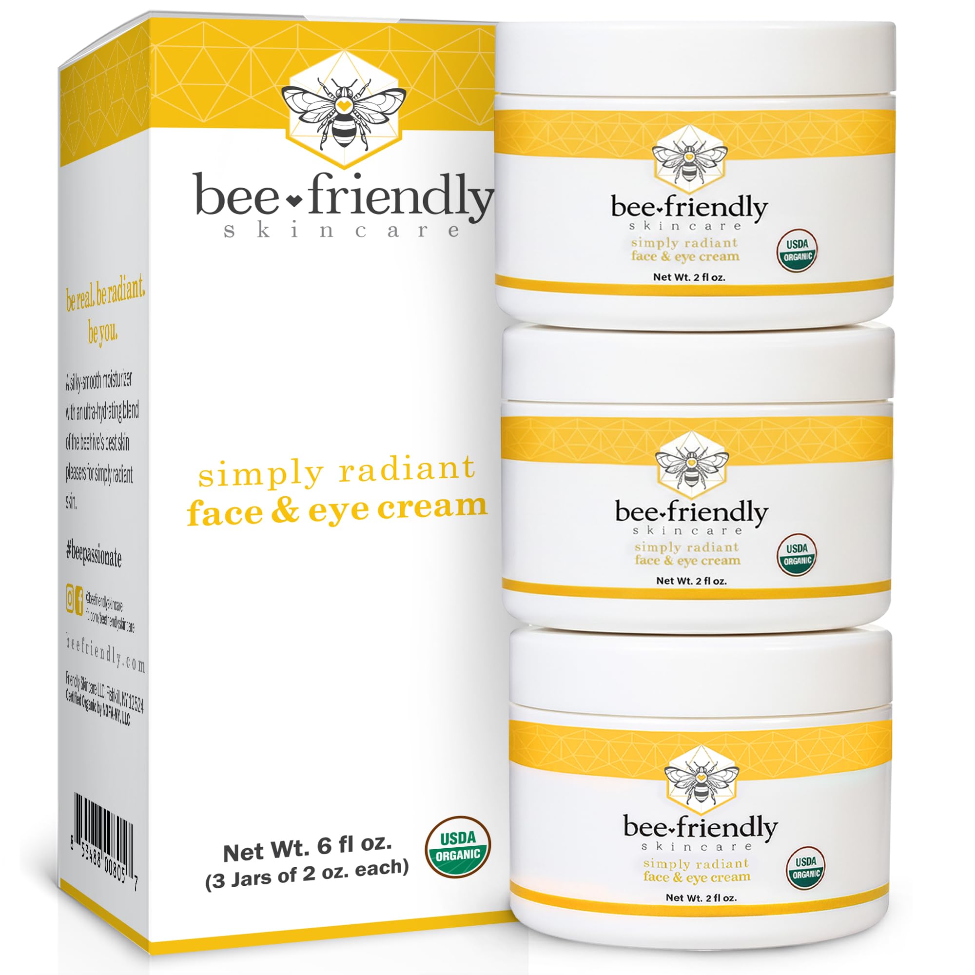 Anti Aging Moisturizing Cream Helps Restore Your Skin To Its Youthful Glory. This specially blended and soothing natural face and eye cream will moisturize and help repair your skin. Your tighter and firmer skin will provide a more healthy appearance. Gentle enough to use on the most delicate of areas on your face, such as the delicate tissue surrounding your eyes. Your skin will be deeply moisturized and wholly nourished by our nutrient dense formula.Why Our USDA Certified Organic Moisturizer Is Better! All natural ingredients means no adverse skin reactions while naturally reversing the effects of aging. Deep Moisturizing Formula Leaves Your Skin Ultra Hydrated. Nutrient Dense All Natural Ingredients FEED your skin. Beeswax improves the elasticity, softness and suppleness of your skin, it is absorbed by your skin and will not clog your pores. Honey is very hydrating for your skin. It also stimulates collagen helping to stimulate skin cell regeneration. Organic olive oil has vitamin A and Vitamin E. No Chemicals, No Parabens, No Animal Testing Light Refreshing Honey Scent. Handmade in USA. USDA Certified Organic. What will it do for you? Softer Skin. Smoother Skin. Firmer Skin. Improved Elasticity. Improved Hydration. Lines and Wrinkles Reduced.Formulated for DEEP Moisturization and Quick Absorption. NO FILLERS or Binders, so the cream is VERY concentrated. A little goes a LONG WAY! Every ingredient has a BENEFICIAL EFFECT on the skin. Leaves your skin well nourished feeling moisturized healthy. Fights off the free radicals which are the root cause of premature aging. BeeFriendly Makes The Highest Quality Skincare Products Around! Specially Priced Limited supply 6 oz Size (3 x 2 oz Jars in box). Natures Healing Properties - RAW HONEY is very hydrating for your skin, it stimulates collagen skin cell regeneration. BEESWAX may improve the elasticity, softness suppleness of your skin will not clog pores, as it is a porous organic substance and non comedegenic. PROPOLIS may help the skin to heal protects it from further damage. BEE POLLEN is rich in many nutrients. ORGANIC OLIVE OIL has Vitamin A Vitamin E same fatty acids as your skin. Four Creams in One - No need to purchase so many different creams moisturizers lotions. ALL IN ONE Eye, Face, Neck and Décolleté Cream. Customers, both men and women, report that their hands are softer than ever due to rubbing the excess into their hands, great for eyelids behind ears! Formulated with all skin types in mind: Combination skin, acne prone skin, sensitive, dry or oily. In time can aid with crows feet, liver spots, bags, circles and dark spots on mature skin naturally. All Natural Certified Organic Ingredients. Purified Water, Organic Extra Virgin Olive Oil, Beeswax w Pollen Propolis, Raw Honey w Royal Jelly, Essential Oils, Vitamin E. ONLY ingredients that are beneficial to your skin. PERIOD. NO CHEMICALS, NO FILLERS, NO SLS, NO ANIMAL TESTING, NO PARABENS, NO FRAGRANCES, Non GMO, GLUTEN FREE. Nature's gift, formulated to heal restore your skin to its supple, youthful best!. Rejuvenating Moisturizer and Face Cream From ALL NATURAL and CERTFIED ORGANIC Ingredients which naturally aid in the reduction of fine lines and wrinkles while deeply moisturizing the facial, eye, neck and décolleté areas of your skin. Our deeply penetrating moisturizer locks in the moisture and leaves your skin feeling and looking YOUTHFUL and RADIANT. Suitable as both a daily day cream and or night cream.