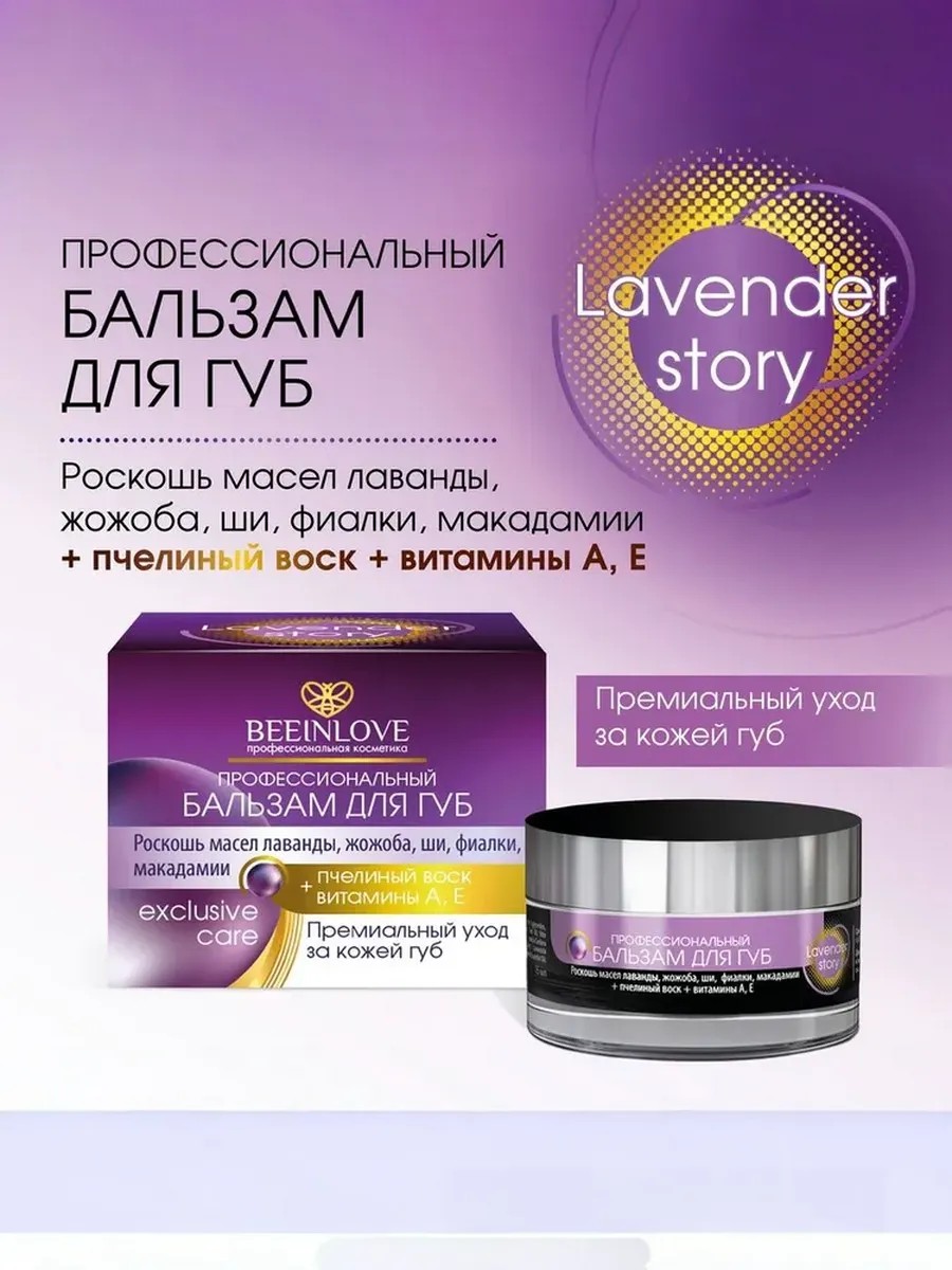 Beeinlove Lavender Story Профессиональный бальзам для губ, 15 мл — это средство премиального ухода с натуральным составом для сухой и чувствительной кожи губ.