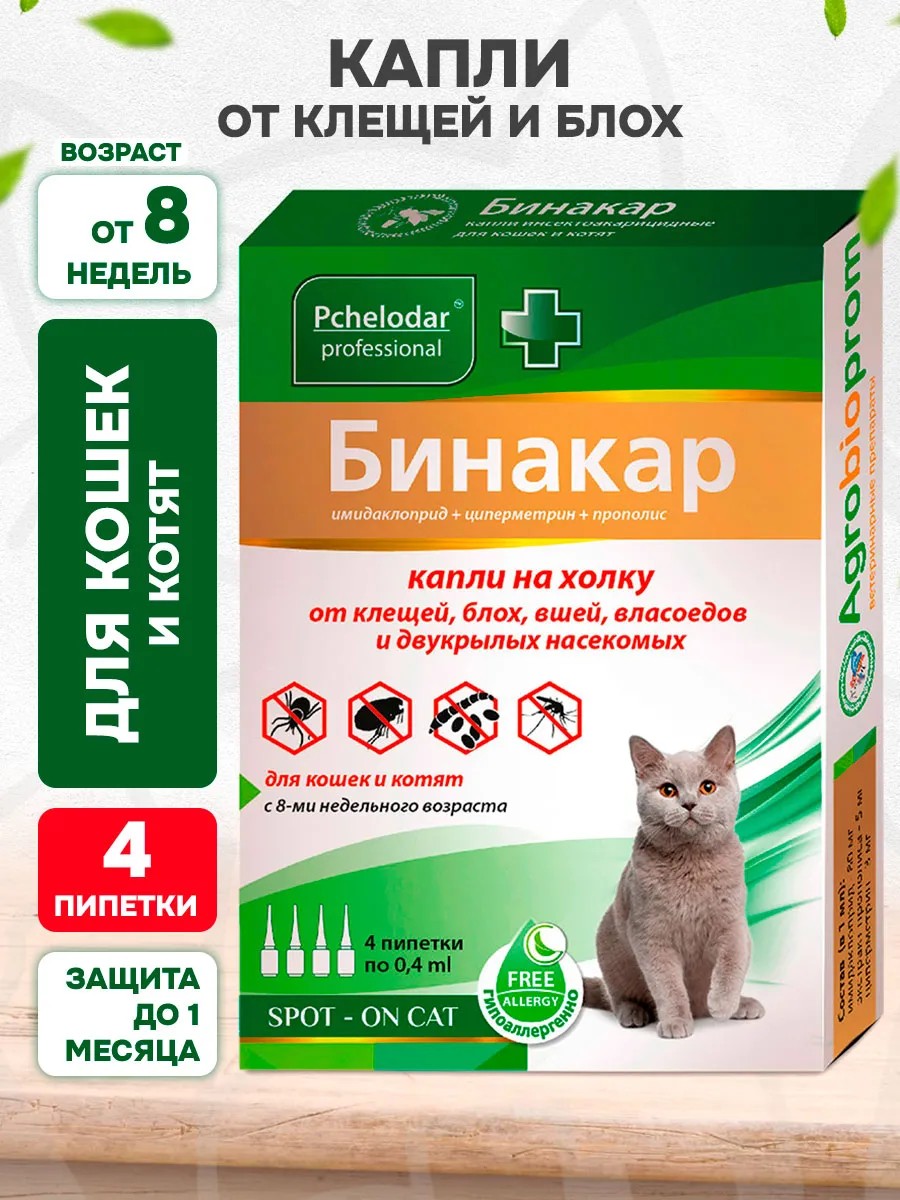Бинакар (Binakar) содержит в качестве действующих веществ в 1 мл: имидаклоприд – 80 мг, циперметрин - 3 мг, экстракт прополиса – 5 мг и вспомогательные компоненты: диметилсульфоксид, полиэтиленгликоль (ПЭГ-400). Препарат Бинакар используют для уничтожения эктопаразитов (иксодовых и чесоточных клещей, блох, вшей, власоедов) на кошках и котятах, а также для защиты от нападения двукрылых насекомых (комаров, мошек и москитов).Перед использованием препарата срезают кончик пипетки и, расположив ее вертикально, наносят капли, раздвинув шерсть, непосредственно на кожу, точечно, в нескольких местах, недоступных для слизывания животным (между лопатками или в области шеи). Побочные явления и осложнения