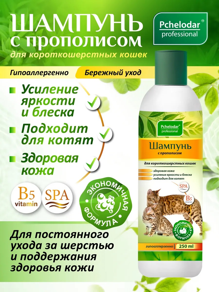 Ваш питомец заслуживает только лучшего, и мы рады представить вам шампунь для короткошерстных кошек с прополисом Пчелодар. Этот уникальный продукт не только эффективно очищает шерсть вашего кота, но и заботится о здоровье его кожи.