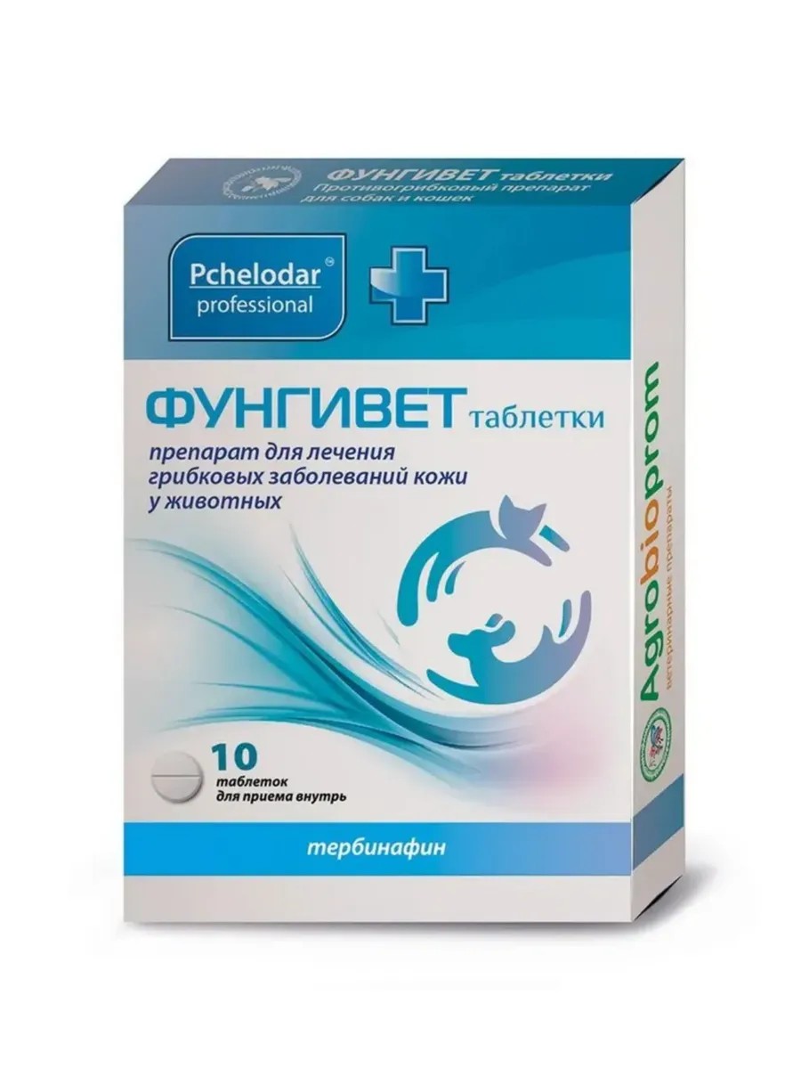 Препарат Фунгивет таблетки предназначен для лечения дерматомикозов у животных (собак и кошек). Препарат применяют для лечения грибковых заболеваний кожи, волос, когтей и слизистых оболочек, вызванных дерматофитами: трихофития и микроспория, а также кандидоза, вызванного дрожжеподобными грибамиПрепарат задают индивидуально кошкам и собакам из расчета 1 таблетка на 10 кг веса принудительно, внутрь, в защечную область или на корень языка с небольшим количеством любимого корма 1 раз в день. Курс применения препарата составляет от 3 до 6 недель в зависимости от показаний и тяжести течения заболевания.Побочные явления и осложнения:При применении препарата в соответствии с настоящей инструкцией побочных явлений и осложнений не наблюдается. При повышенной индивидуальной чувствительности животного к компонентам препарата использование его следует прекратить. С осторожностью препарат следует назначать животным с хронической почечной недостаточностью, нарушениями кроветворения, эндокринными болезнями, опухолями, системной и кожной волчанкой. При появлении следующих симптомов: тошнота, ухудшение аппетита, желтуха, потемнение мочи, слабость, светлый кал, препарат следует отменить.Противопоказания:Противопоказаниями к применению препарата являются: повышенная чувствительность к его компонентам (в том числе в анамнезе). Беременность и период лактации. Острые и хронические заболевания печени. Безопасность применения животным до 1 года не изучена и при необходимости препарат назначается только под наблюдением ветеринарного врача.Передозировка:В случае передозировки у животных может отмечаться: сыпь, тошнота, рвота, боль в эпигастральной области, частое мочеиспускание. Важно провести промывание желудка, а также практикуют прием активированного угля, симптоматическое лечение.Особые указания:Препарат Фунгивет таблетки не предназначен для применения продуктивным животным.Хранить в закрытой упаковке производителя в сухом, защищенном от прямых солнечных лучей месте, отдельно от пищевых продуктов и кормов, при температуре от 0 до +25°С.