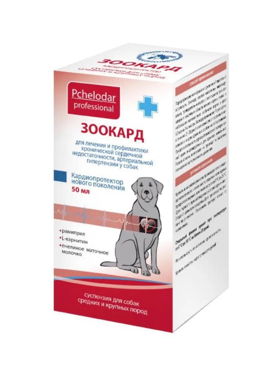 Зоокард назначают собакам при застойных явлениях, вызванных хронической сердечной недостаточностью, при артериальной гипертензии, при почечной недостаточности, при кардиомиопатиях различного генеза, а также для профилактики ишемии миокарда (инфаркт, инсульт и т.д.). Зоокард назначают для повышения выносливости к физическим нагрузкам и выживаемости у собак с врожденными пороками сердца. ПРОТИВОПОКАЗАНИЯ Повышенная индивидуальная чувствительность к компонентам препарата (в том числе в анамнезе), ангионевротический отек, стеноз митрального клапана, стеноз аорты, тяжелые нарушения функции печени и почек. Не рекомендуется применять беременным и лактирующим самкам. Симптомы передозировки у животных не выявлены.
