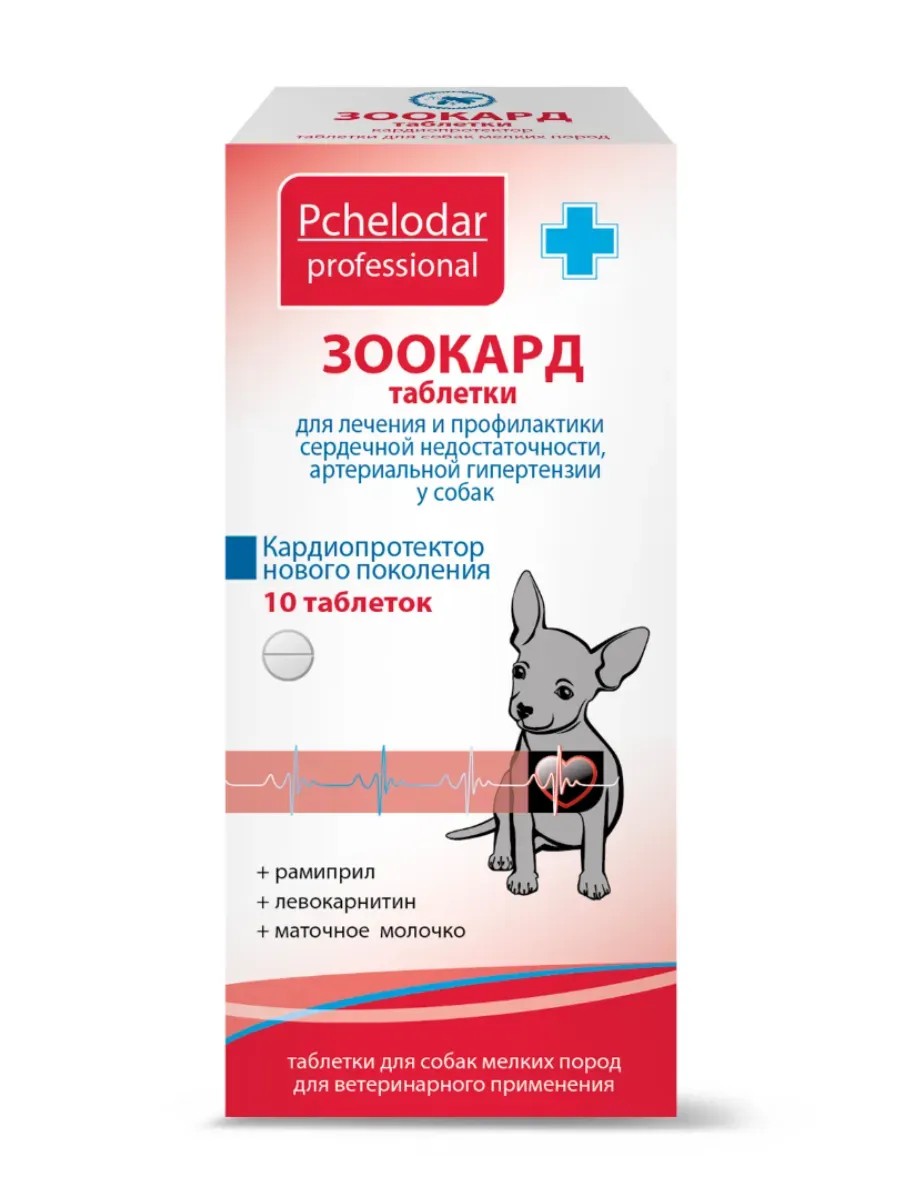 Зоокард назначают собакам при застойных явлениях, вызванных хронической сердечной недостаточностью, при артериальной гипертензии, при почечной недостаточности, при кардиомиопатиях различного генеза, а также для профилактики ишемии миокарда (инфаркт, инсульт и т.д.). Зоокард назначают для повышения выносливости к физическим нагрузкам и выживаемости у собак с врожденными пороками сердца. ПРОТИВОПОКАЗАНИЯ Повышенная индивидуальная чувствительность к компонентам препарата (в том числе в анамнезе), ангионевротический отек, стеноз митрального клапана, стеноз аорты, тяжелые нарушения функции печени и почек. Не рекомендуется применять беременным и лактирующим самкам. Симптомы передозировки у животных не выявлены.
