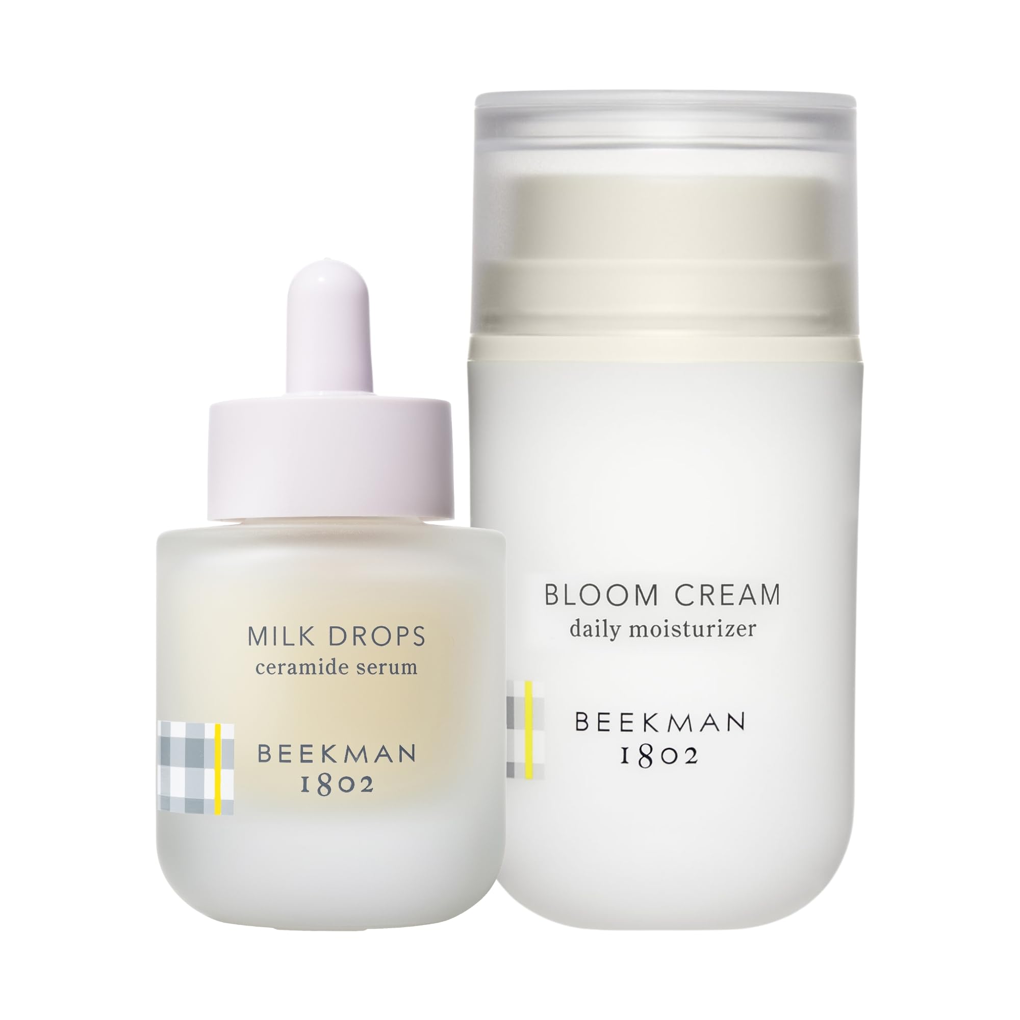 BEYOND CLEAN - Clinically Kind is the Beekman 1802 approach, our formula is free from toxins harsh ingredients known to irritate sensitive skin, including parabens, sulfates, phthalates, synthetic fragrances, abrasive exfoliants microplastics. THE GOAT MILK DIFFERENCE - Goat milk is rich in lactic acid (a natural exfoliant) contains the same pH as human skin, which helps keep the microbiome of your skin well-balanced prevent visible signs of irritation, sensitivity premature aging. BLOOM CREAM DAILY MOISTURIZER - Our 1 best-selling daily moisturizer mimics your natural skin barrier absorbs instantly to support protect skin. It helps control oily skin, boosts the appearance of skin health, and fights dullness. MILK DROPS SERUM - Our highest-concentrated, most-potent treatment, this lightweight milk postbiotic serum is packed with essential ceramides, squalane, hyaluronic acid plant enzymes to invigorate dull skin, giving you skin-blooming radiance. MILK DROPS BLOOM CREAM - This bundle includes one Milk Drops Ceramide Face Serum (0.95 oz) and one Bloom Cream Daily Face Moisturizer (1.69 oz).
