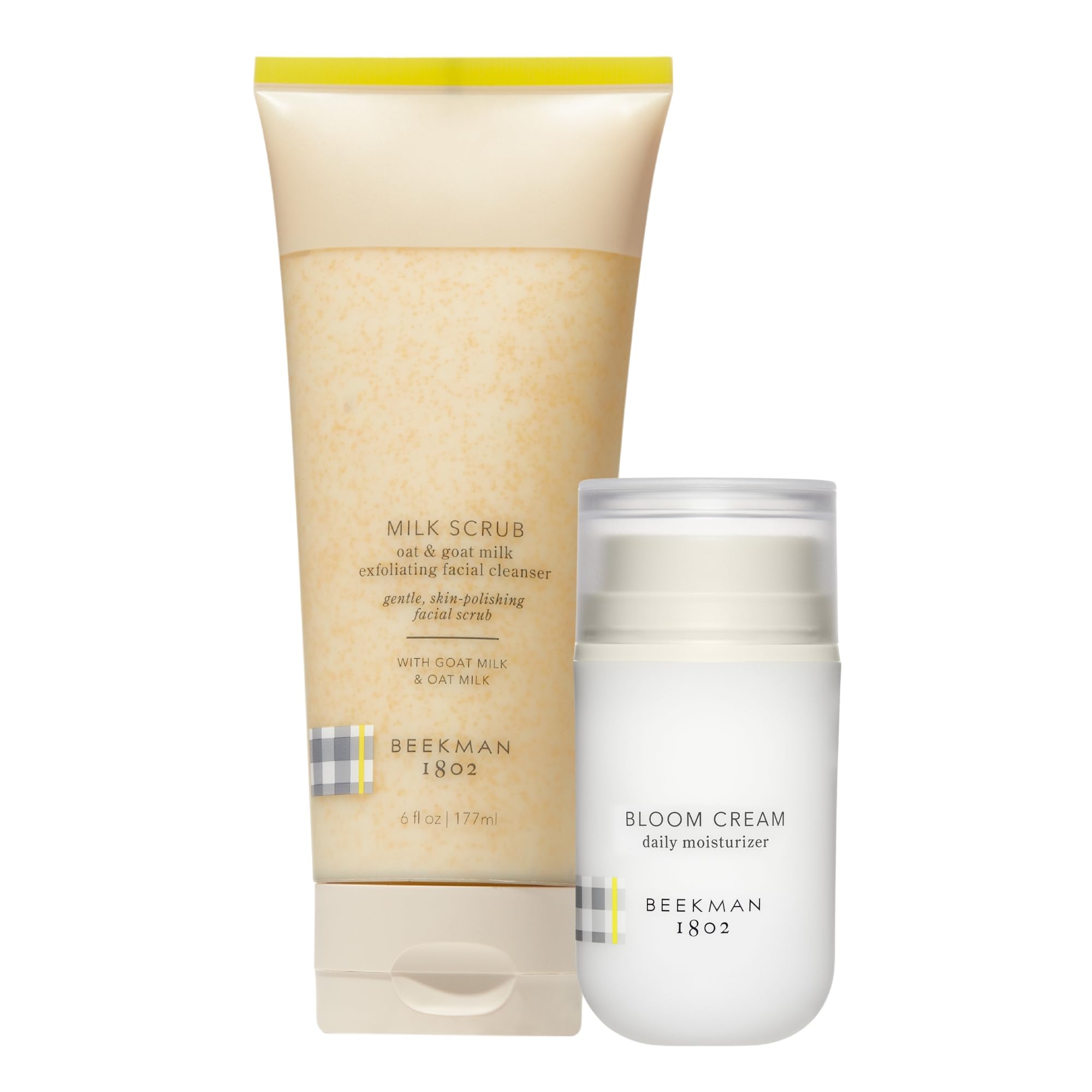 BEYOND CLEAN - Clinically Kind is the Beekman 1802 approach, our formula is free from toxins harsh ingredients known to irritate sensitive skin, including parabens, sulfates, phthalates, synthetic fragrances, abrasive exfoliants microplastics. THE GOAT MILK DIFFERENCE - Goat milk is rich in lactic acid (a natural exfoliant) contains the same pH as human skin, which helps keep the microbiome of your skin well-balanced prevent visible signs of irritation, sensitivity premature aging. BLOOM CREAM DAILY MOISTURIZER - Our 1 best-selling daily moisturizer mimics your natural skin barrier absorbs instantly to support protect skin. It helps control oily skin, boosts the appearance of skin health, and fights dullness. MILK SCRUB - Milk Scrub is the first-ever oat milk goat milk facial scrub that's skin barrier biome safe. Unlike other scrubs that use skin-damaging exfoliants, Milk Scrub is formulated with jojoba beads is proven to gently polish skin. MILK SCRUB BLOOM CREAM - This bundle includes one Milk Scrub Oat Goat Milk Exfoliating Face Cleanser (6 fl oz) and one Bloom Cream Daily Face Moisturizer (1.69 oz).