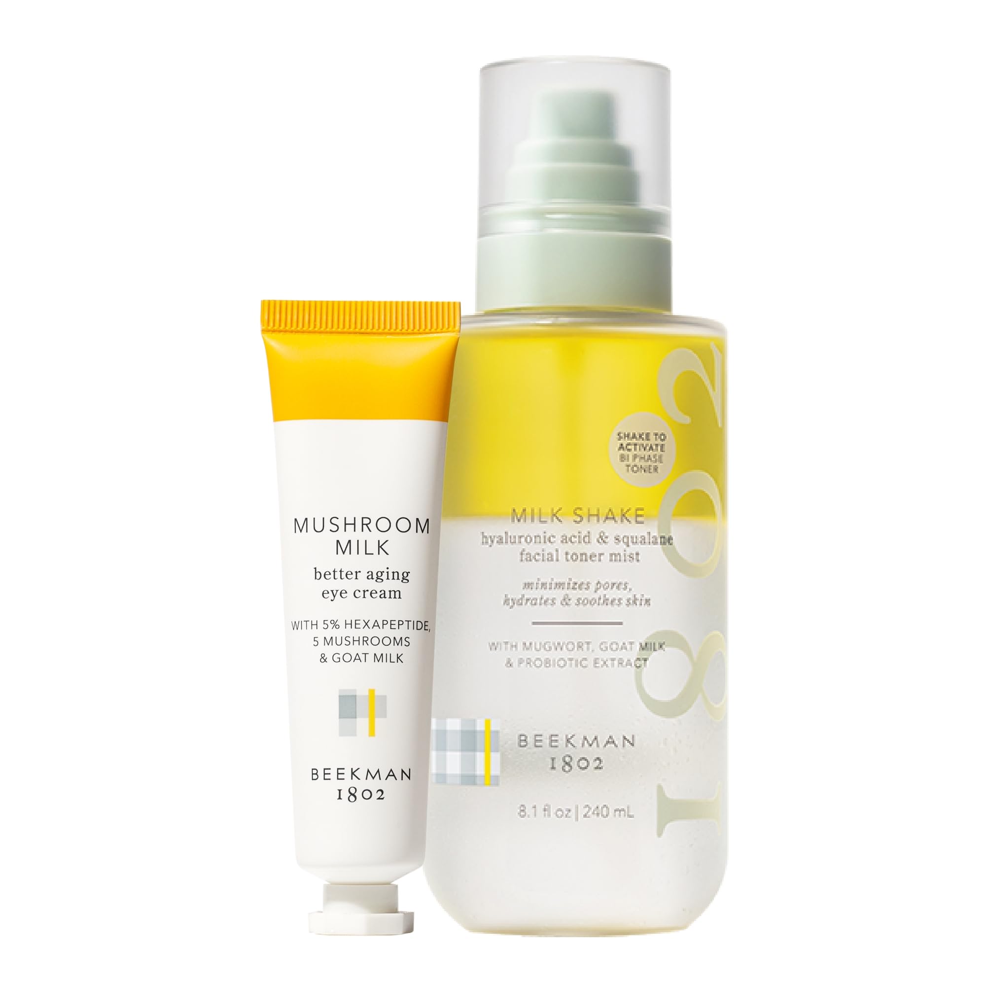 CLINICALLY KIND - Clinically Kind is the Beekman 1802 approach to skincare. Our effective, cruelty-free formulations are clinically tested, scientifically proven made to work with your skin, not against it. BEYOND CLEAN - Our formula is free from toxins harsh ingredients known to irritate sensitive skin, including parabens, sulfates, phthalates, synthetic colors fragrances, abrasive exfoliant particles, and microplastics. THE GOAT MILK DIFFERENCE - Goat milk is rich in lactic acid (a natural exfoliant) contains the same pH as human skin, which helps keep the microbiome of your skin well-balanced prevent visible signs of irritation, sensitivity premature aging. MILK SHAKE TONER - Our alcohol-free, 2-in-1 formula blends goat milk prebiotic mugwort with squalane hyaluronic acid to keep sensitive skin toned hydrated. It supports the skin barrier without clogging pores, and relieves redness irritation. BETTER AGING EYE CREAM - Mushroom Milk is a better aging goat milk eye cream that restores youthful, radiant eyes. This deeply moisturizing treatment reduces the look of fine lines and dark circles is safe for delicate skin around eyes. MUSHROOM MILK EYE CREAM MILK SHAKE TONER - This bundle includes one Mushroom Milk Better Aging Eye Cream (0.68 fl oz) and one Milk Shake Hydrating Toner Face Mist (8.1 fl oz).