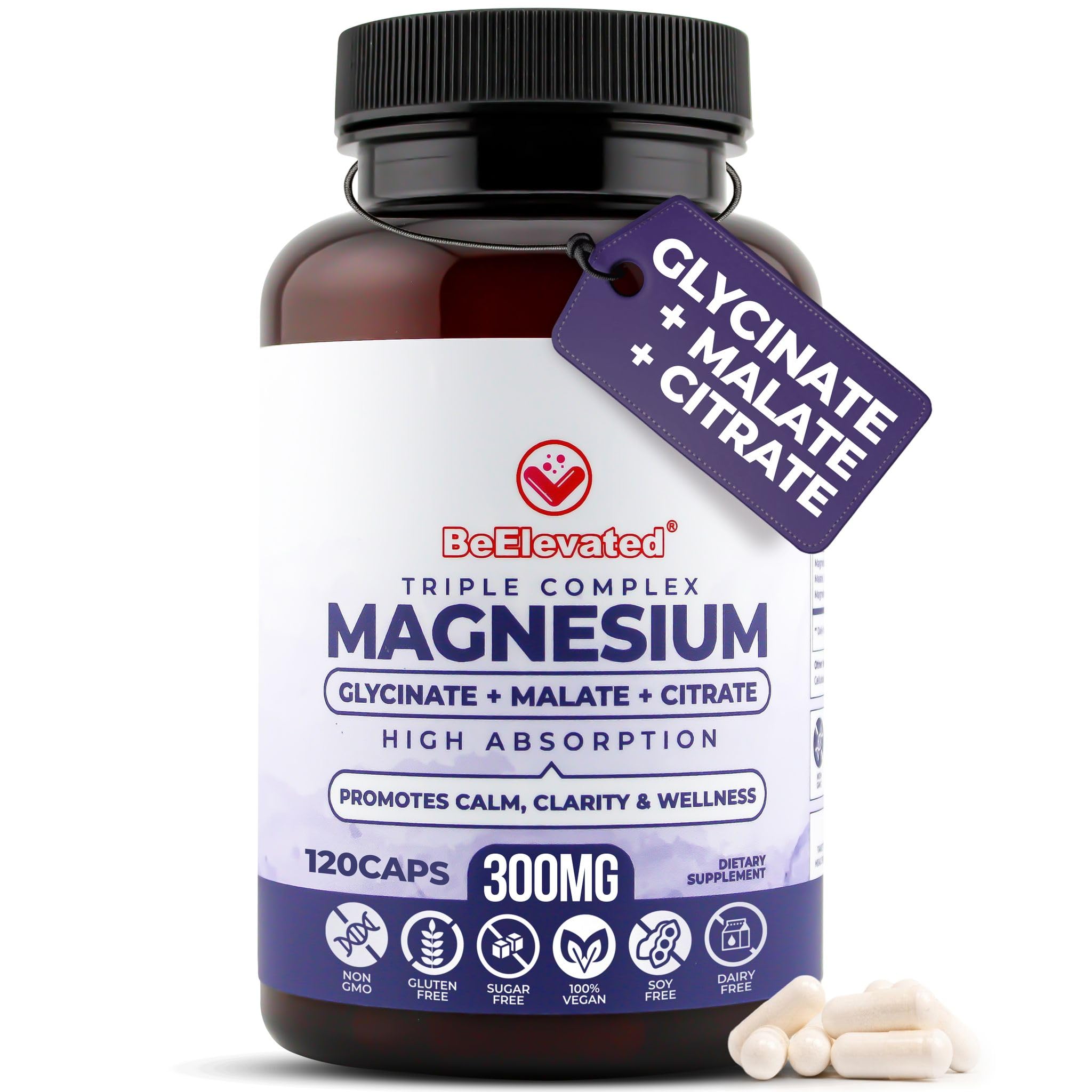 BeElevated Triple Magnesium Complex for Women and Men Magnesium Glycinate Citrate Malate Supplement for Daily Wellness Vegan Non-GMO - 120 Capsules (60-Day Supply)