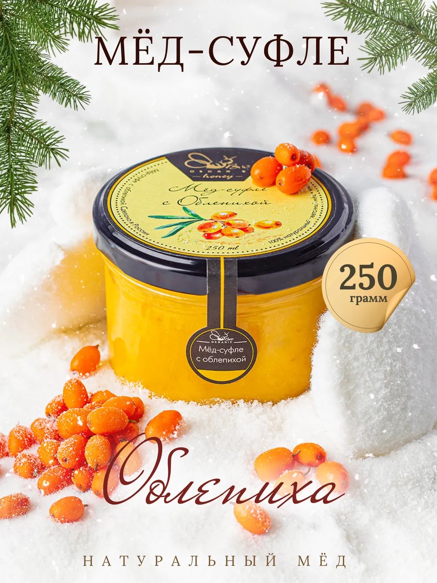 Медовое суфле изготавливается процессом медленного взбивания натурального цветочного меда с добавлением разных вкусов ягод и фруктов. Это приятный и полезный продукт, имеет воздушную консистенцию, является природным антидепрессантом. Ни одна сладкоежка не останется равнодушна к такому изысканному десерту. «Гремучая смесь» в борьбе с простудой — облепиха и мед. Эти два мощных ингредиента содержат целый витаминный комплекс и десятки микроэлементов и являются поистине лечебными. Эта не имеющая аналогов смесь успешно используется для борьбы с вирусами, инфекциями, да и просто отлично поднимает настроение. Вкус сладкий, с ярко выраженной кислинкой. Мед суфле fresh в стильную баночку объемом 250 грамм, что позволяет использовать его как оригинальный сладкий подарок на любой праздник, например родителям на новый год или рождество. Отличный вариант для людей на правильном питании (пп).
