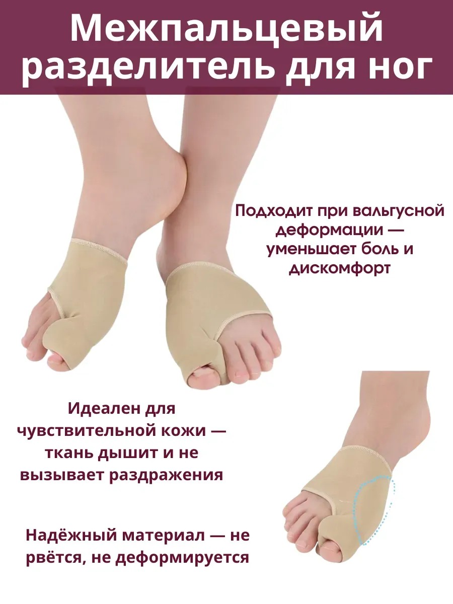 Бандаж выполнен в форме мягкого носочка, который легко надевается и надежно фиксируется на ноге. Он не скользит, не сбивается при движении и не создает ощущения дискомфорта даже при длительной носке.В области косточки большого пальца под тканью спрятана силиконовая накладка. Она мягко прилегает к коже, снижая давление на воспалённую область и уменьшая болевые ощущения. Размер накладки позволяет ей закрывать даже выраженное воспаление. Межпальцевый силиконовый разделитель помогает удерживать большой и второй палец в правильном положении, предотвращая их перекрещивание и дальнейшее смещение. Это особенно важно на начальных стадиях вальгусной деформации.