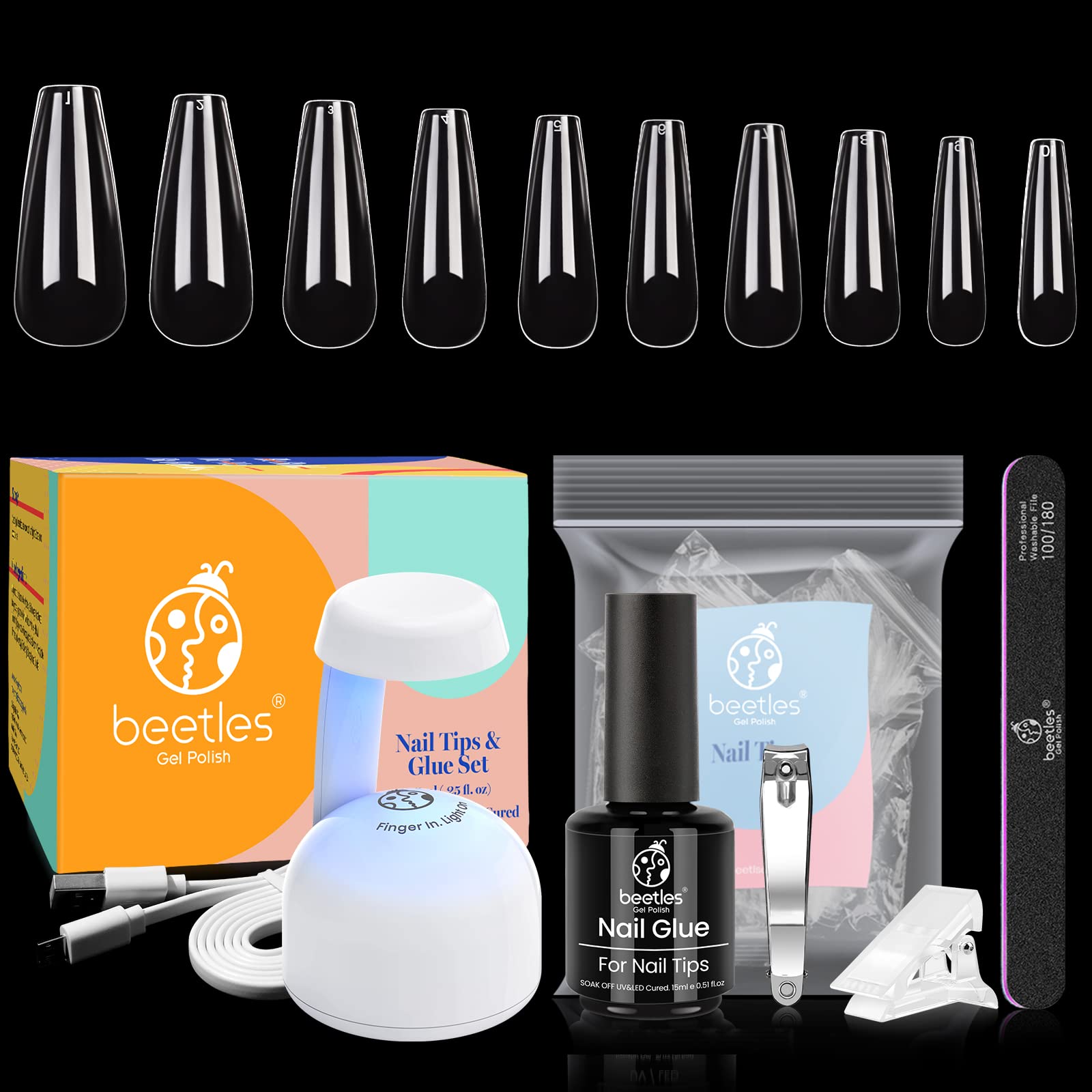 Beetles Acrylic Nail Tips Nail Glue Lamp Kit 2 In 1 15ML Nail Glue Gel with Long Coffin False Nail and UV LED Nail Lamp for Easy and Fast Nail Extension DIY Nail Art