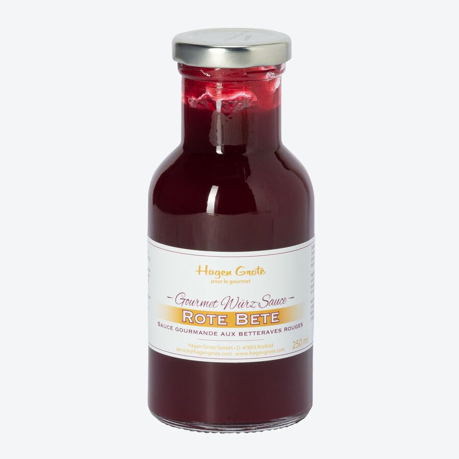 - All-natural ingredients - Long shelf life - Particularly tasty - Perfect with fondues and raclettes This delicious condiment sauce is made in our delicatessen workshop from all-natural ingredients. To ensure the best quality, only small quantities are produced according to strict manufacturing criteria. Since the sauces are cooked very briefly, the beautiful colors and precious flavors are preserved. With the sweet and sour beetroot condiment sauce, you can enjoy grilled vegetables, beef steaks or pork. Also use it to refine sauces and dressings. 250 ml bottle. Exclusive to Hagen Grote Ingredients: beetroot 53 , sugar, onions, vinegar, water, thickener: modified starch, sea salt Net quantity: 250 ml Average nutritional values per 100 g 100 ml Energy value: 606 kJ 143 kcal Fat:Perfect for accompanying fondues and raclettes. Particularly tasty. Long-lasting. All-natural ingredients. - Ingrédients entièrement naturels - Longue conservation - Particulièrement goûteuses - Parfaites pour accompagner les fondues et les raclettes Cette délicieuse sauce-condiment est fabriquée dans notre atelier d'épicerie fine à partir d'ingrédients entièrement naturels. Afin d'assurer une qualité optimale, seules de petites quantités sont produites selon de sévères critères de fabrication. Les sauces étant cuites très brièvement, les belles couleurs et les saveurs précieuses sont préservées. Avec la sauce-condiment aux betteraves rouges aux saveurs aigres-douces, vous dégusterez légumes grillés, steaks de boeuf ou porc. Utilisez-la également pour affiner sauces et vinaigrettes. Flacon de 250 ml. Exclusif Hagen Grote Ingrédients : betterave rouge 53 , sucre, oignons, vinaigre, eau, épaississant : amidon modifi é, sel de mer Quantité nette : 250 ml Valeurs nutritionnelles moyennes pour 100 g 100 ml Valeur énergétique : 606 kJ 143 kcal Lipides :Parfaites pour accompagner les fondues et les raclettes. Particulièrement goûteuses. Longue conservation. Ingrédients entièrement naturels.