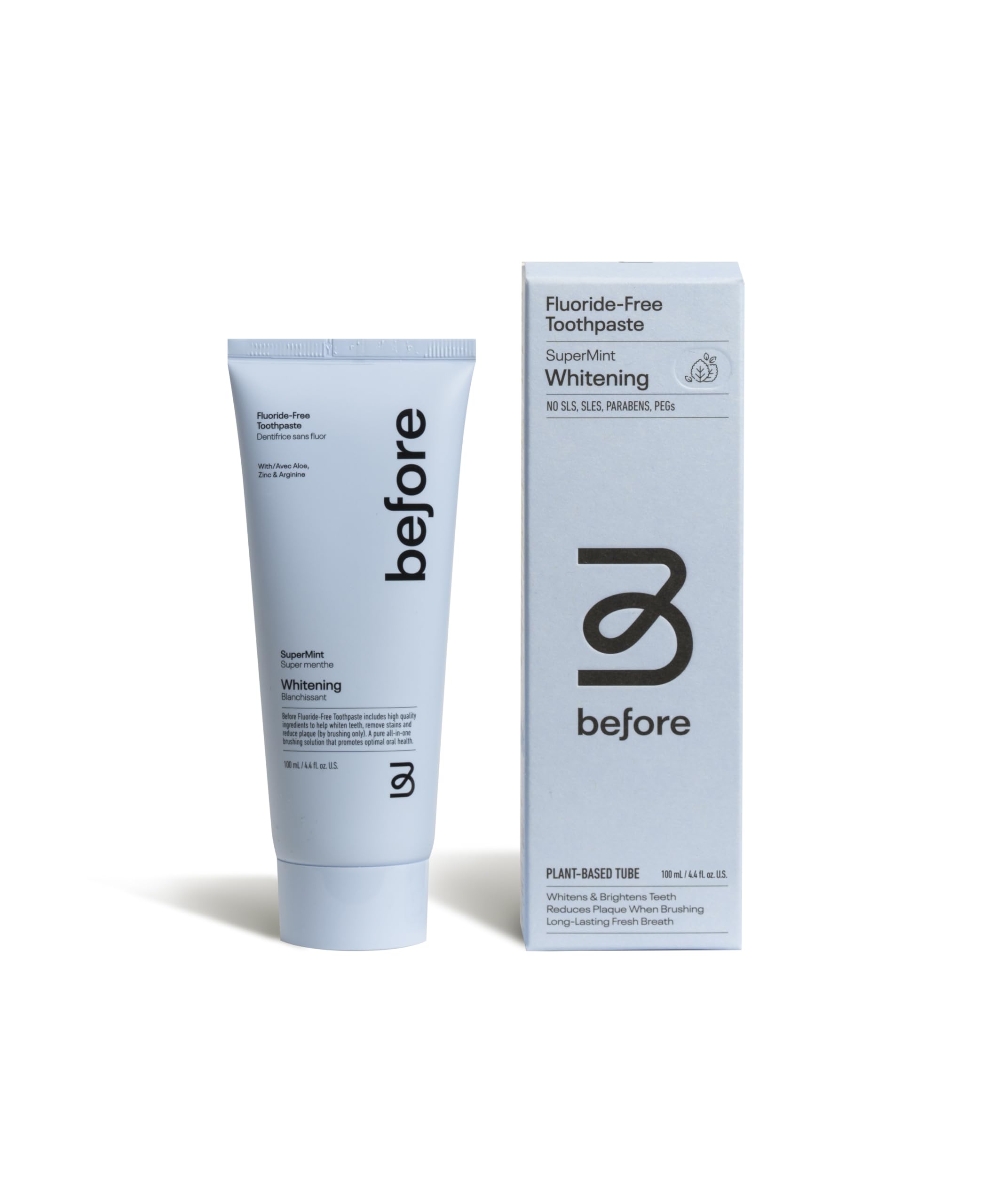 Introducing Before's SuperMint Fluoride-Free Whitening Toothpaste — the perfect next-level upgrade to your oral care routine that's made in the USA. Formulated with our custom blend of clean, high-quality ingredients, this whitening toothpaste gently brightens and protects your smile, using a low-abrasion formula made with sodium bicarbonate, aka baking soda, calcium carbonate to safely reduce stains and remineralize enamel. Natural aloe extract soothes gums and boosts immunity, while zinc arginine support a healthy oral microbiome for long-lasting, all-day freshness. Enjoy a cool and refreshing SuperMint flavor sourced from pure peppermint and spearmint oils, leaving your mouth feeling fresh all day. Free from SLS, parabens, PEGs, and synthetic additives, this anti-cavity toothpaste is vegan, gluten-free, and cruelty-free (Leaping Bunny certified). It also comes in a 100 recyclable, plant-based sugarcane 4.4oz tube. Whether at home or traveling, this SuperMint toothpaste is essential to your morning routine and gets you going in the right direction Before Life Happens.HELPS PROTECT TEETH: Sodium bicarbonate calcium carbonate help whiten and polish teeth, neutralizing plaque and removing surface stains xylitol helps combat bacteria to lower cavity risks aloe extract soothes gums and helps boost your immune system. DENTIST RECOMMENDED FORMULA: Our custom formulation delivers quality performance using clean ingredients coconut-derived Cocamidopropyl Betaine helps deliver silky foaming without SLS, while Zinc Arginine help balance bacteria for oral health. CLEAN SAFE INGREDIENTS: Say NO to hydrogen peroxide, artificial flavors, SLS irritants parabens on your teeth this fluoride-free toothpaste is a modern alternative, with values that keep this product cruelty-free, gluten-free vegan. SUPERMINT FLAVOR: Our game-changing menthol SuperMint flavor will blow you away with long-lasting, ultra-cool breath made from natural mint oils, including spearmint peppermint oil, start looking forward to your next refreshing brush. FLUORIDE-FREE WHITENING: Safely brighten your smile with this toothpaste's custom minty blend of natural ingredients, made fluoride-free to promote optimal oral hygiene our low-abrasion formula helps remineralize enamel and strengthen tooth integrity.