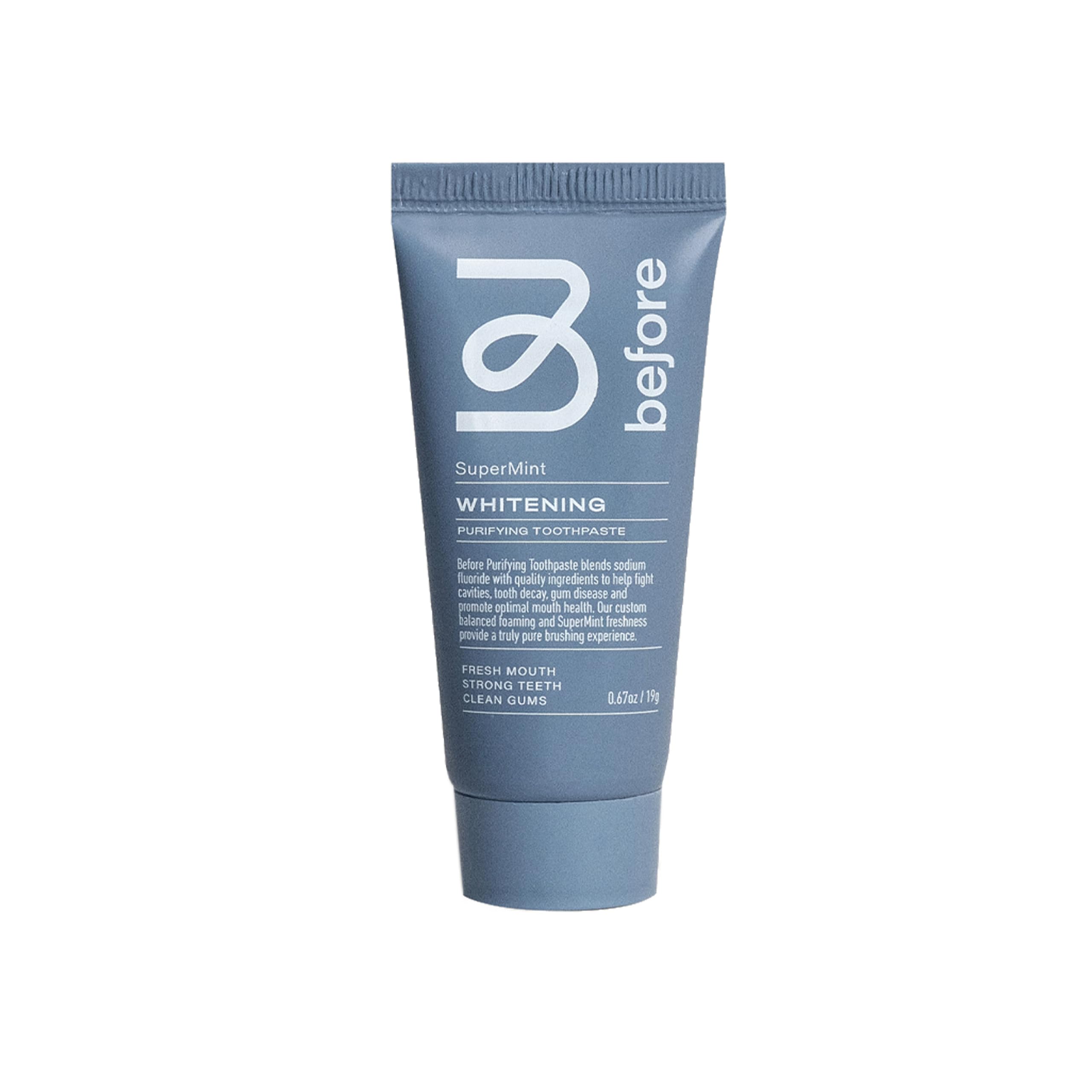 INCREDIBLE TASTE. Our game-changing minty menthol flavor will blow you away with long-lasting, ultra-cool breath after every brush. Made from natural menthol, spearmint peppermint oil, start looking forward to your next refreshing brush. HELPS PROTECT TEETH. Naturally occurring Sodium Fluoride helps stop enamel demineralization and strengthen weak spots. Sodium Bicarbonate helps whiten and polish teeth, neutralizing plaque. Aloe extract soothes gums and helps boost your immune system. DENTIST RECOMMENDED FORMULA. Our custom formulation delivers quality performance using clean ingredients. Coconut-derived Cocamidopropyl Betaine helps deliver silky foaming without SLS, while Zinc Arginine help balance bacteria for oral health. WHAT THIS TOOTHPASTE IS NOT. Say NO to hydrogen peroxide, artificial flavors, SLS irritants body-altering parabens on your teeth. This mini toothpaste is a modern alternative, with values that keep this product cruelty-free, gluten-free vegan. TRAVEL SIZE WHITENING. Upgrade your brushing on the go with this award-winning Whitening Toothpaste from Before. Start seeing whiter and brighter teeth with this custom blend of premium ingredients that strengthen tooth enamel and fight cavities.