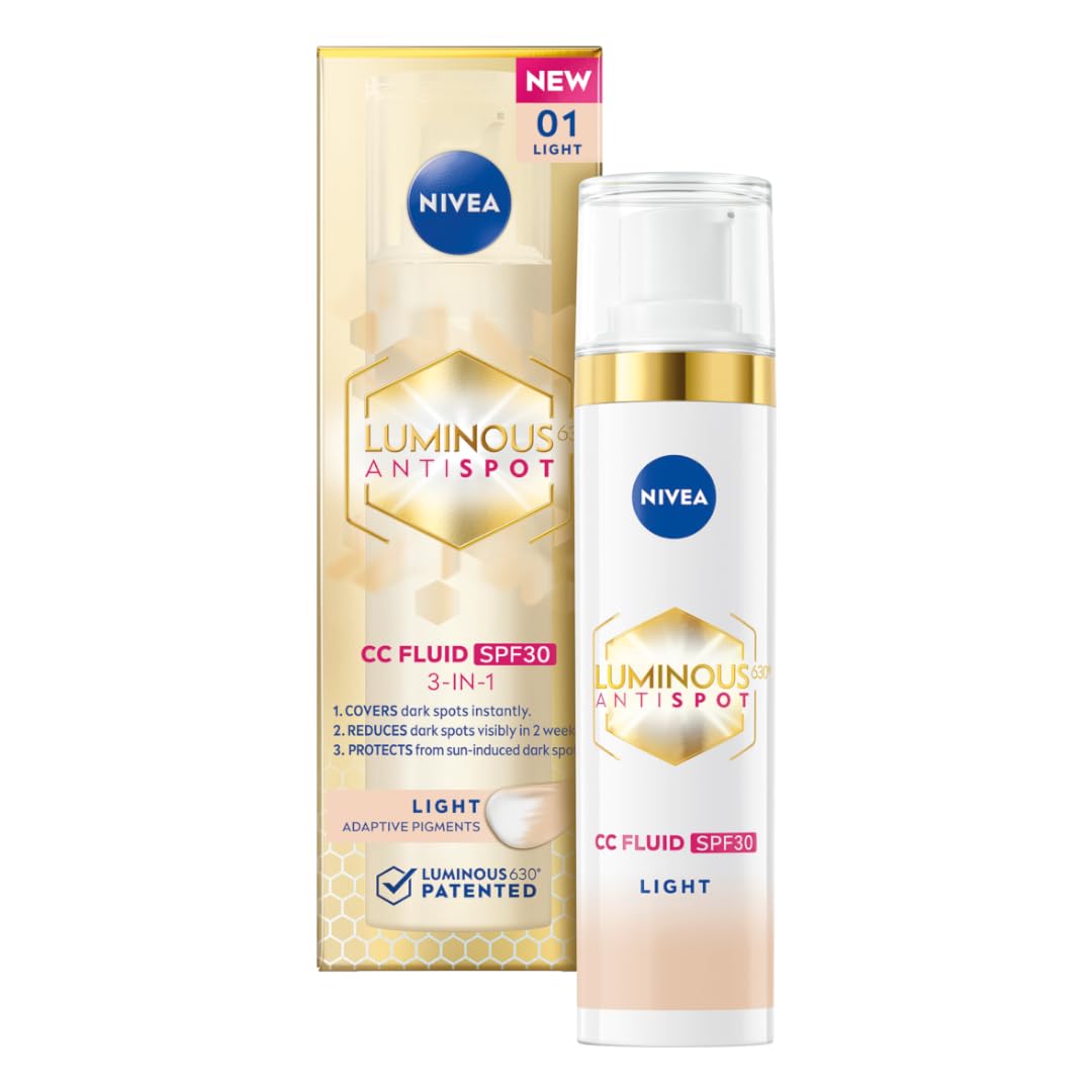 Nivea LUMINOUS630 Anti-pigmentation is the perfect CC cream that offers a triple action: (1) KRYJES: microcapsules with skin correction pigment provide natural coverage and immediately compensate for blemishes and blemishes (2) REDUCT: the formula with LUMINOUS630 visibly reduces discoloration within 2 weeks and that compares the skin color by 40 in 8 weeks. (3) PROTECTION: the formula with SPF30 protects you from the sun and prevents new discolouration. BRAND INNOVATION NIVEA scientists spent 10 years of painstaking research and testing more than 50,000 ingredients to find LUMINOUS630 . LUMINOUS630 balances pigmentation at the cellular level to reduce existing discolorations and prevent recurrence. Self-assessment, 12-week study among 51 women, conducted in 2023. INGREDIENTS Aqua, glycerin, C12-15 Alkyl Benzoate, Methylpropanediol, bis-ethylhexyxyphenol methoxyphenyl triazine, methoxydibenzoylmethane butyl, butylene glycol dicaprilate diaprate, glyceryl stearate, dibutyl adium pate, pate, Phenylyl benzimidazole sulfonic acid, behenyl alcohol, CI 77891, cetearyl alcohol, ethylhexyltriazone, isobutylamido thiazolyl, resorcinol, sodium hyaluronate, tocopheryl acetate, sodium stearoiloglutamate, ethylhexylglycerin, 1,2-hexane odiol, xanthene rubber, cellulose acetate, magnesium stearate, propylene glycol stearate, tapioca starch, trisodium EDTA, sodium hydroxide, sodium chloride, phenoxyethanol, perfume, CI 77492, CI 77499, CI 77491 INSTRUCTIONS FOR USE Apply daily to cleansed skin. Spread over the entire face. SAFETY WARNING For external use only. See moreFor an even, radiant complexion without imperfections. 3rd PROTECTION: the formula with SPF 30 protects the skin from the sun and prevents discoloration. 2nd REDUCT: formula with patented LUMINOUS visibly reduces discoloration in 2 weeks. 1st CRYJE: with pigment microcapsules, it compensates for skin tone and conceals imperfections. Anti-discoloration cream CC with SPF 30 offers a triple effect:.NIVEA LUMINOUS630 Anti-verkleuring CC SPF 30, kleur 01 light 40 ml Nivea LUMINOUS630 Anti-pigmentatie is de perfecte CC-crème die een drievoudige werking biedt: (1) KRYJES: microcapsules met huidhuidcorrectiepigment zorgen voor een natuurlijke dekking en compenseren onvolkomenheden en onvolkomenheden onmiddellijk (2) REDUCT: de formule met LUMINOUS630 vermindert zichtbaar verkleuring binnen 2 weken en dat vergelijkt de huidskleur met 40 in 8 weken. (3) BESCHERMING: de formule met SPF30 beschermt je tegen de zon en voorkomt nieuwe verkleuringen. BRAND INNOVATIE NIVEA-wetenschappers hebben 10 jaar nauwgezet onderzoek gedaan en meer dan 50.000 ingrediënten getest om LUMINOUS630 te vinden. LUMINOUS630 brengt pigmentatie op cellulair niveau in evenwicht om bestaande verkleuringen te verminderen en herhaling te voorkomen. Zelfbeoordeling, 12 weken studie onder 51 vrouwen, uitgevoerd in 2023. INGREDIËNTEN Aqua, glycerine, C12-15 Alkyl Benzoate, Methylpropanediol, bis-ethylhexyxyphenol methoxyphenyl triazine, methoxydibenzoylmethane butyl, butyleen glycol dicaprilate diaprate, glyceryl stearate, dibutyl adium pate, pate, Phenylyl benzimidazol sulfonzuur, behenylalcohol, CI 77891, cetearylalcohol, ethylhexyltriazon, isobutylamido thiazolyl, resorcinol, natriumhyaluronaat, tocoferylacetaat, natriumstearoiloglutamaat, ethylhexylglycerine, 1,2-hexaan odiol, xantanteen rubber, cellulose acetaat, magnesiumstearaat, propyleenglycolstearaat, tapiocazetmeel, trisodium EDTA, natriumhydroxide, natriumchloride, fenoxyethanol, parfum, CI 77492, CI 77499, CI 77491 GEBRUIKSAANWIJZING Dagelijks op de gereinigde huid aanbrengen. Verspreid over het hele gezicht. VEILIGHEIDSWAARSCHUWING Alleen voor uitwendig gebruik. Meer bekijkenVoor een gelijkmatige, stralende teint zonder onvolkomenheden. 3e BESCHERMING: de formule met SPF 30 beschermt de huid tegen de zon en voorkomt verkleuringen. 2e REDUCT: formule met gepatenteerde LUMINOUS vermindert zichtbaar verkleuring in 2 weken. 1e CRYJE: met microcapsules met pigment compenseert de huidskleur en verbergt onvolkomenheden. Anti-verkleuringscrème CC met SPF 30 biedt een drievoudige werking:.