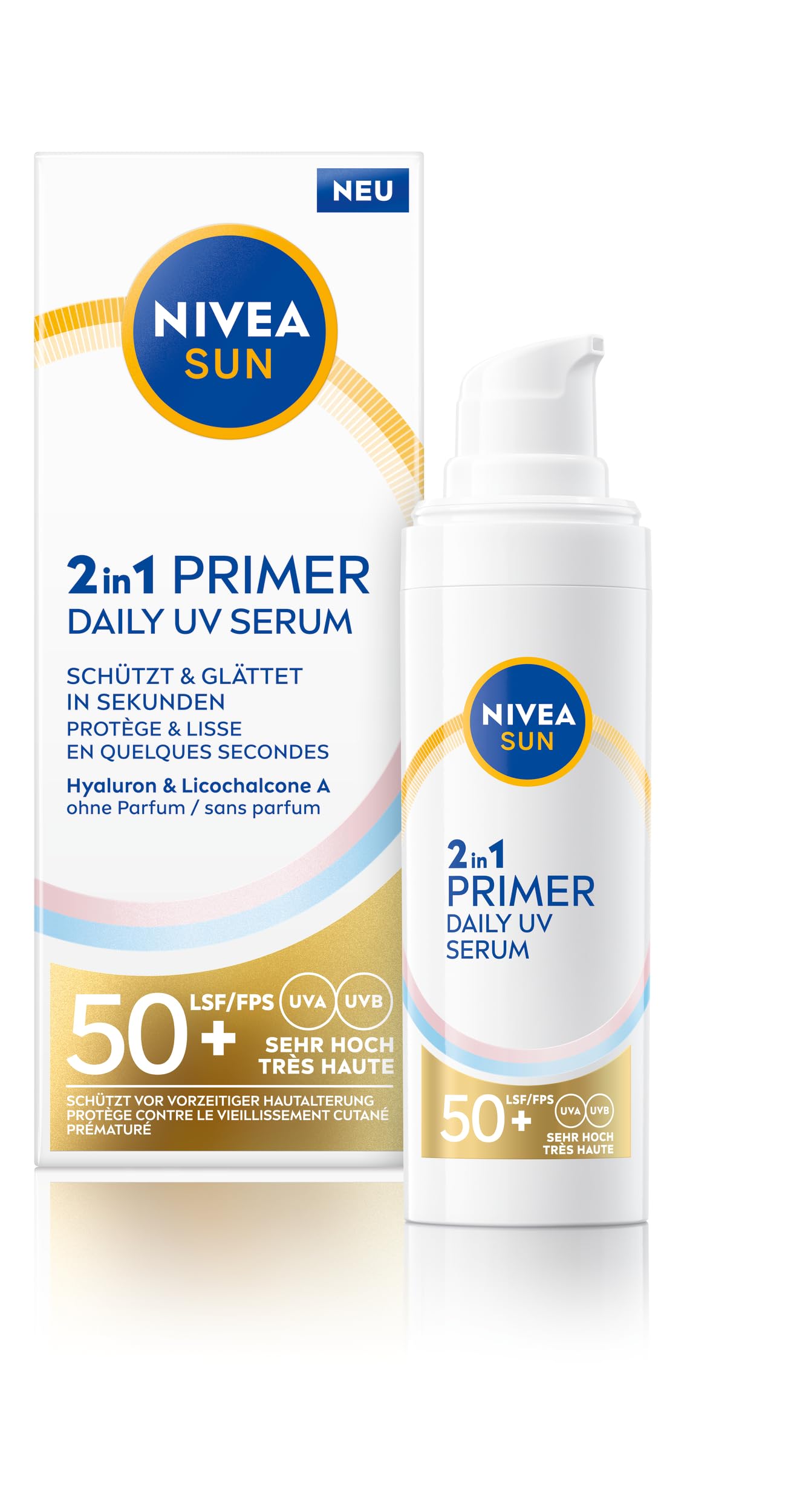 Nivea Primer Daily UV Serum 2-in-1 SPF50 has been specially developed for sensitive facial skin. The innovative, ultra-light formula protects healthy skin against UVA UVB rays and against high-energy visible light (HEVL) that causes premature skin aging. Enriched with two types of hyaluronic acid and Licochalcone A, an effective antioxidant. The light formula is rigid, quickly absorbed and does not leave a sticky or white feeling. Provides an even and noticeably smooth complexion, prepares hair for flawless makeup and extends wear. Skin tolerance dermatologically tested. INGREDIENTS Aqua, Alcohol Denat., Butyl methoxydibenzoylmethane, C12-15 Alkyl Benzoate, Isopropyl Palmitate, bis-ethylhexyloxyphenol methoxyphenyl triazine, dibutyl adipate, dipropylene glycol dibenzoate, ethylhexyl triazine zone, zone, Diethylamino hydroxybenzoyl hexyl benzoate, distarch phosphate, glyceryl stearate SE, Phenylbenzimidazole sulfonic acid, silica dimethyl silylate, glycerin, glycyrrhiza inflata root extract, tocopheryl acetate, sodium hyaluronate, tapioca starch, Microcrystalline Cellulose, Copernicia Cerifera Cera, Hydrogenated Rapeseed Oil, Polyglyceryl-3 Methylglucose Distearate, Diisostearoyl Polyglyceryl-3 Dimer Dilinoleate, - SAFETY WARNING Avoid contact with the eyes See moreProvides an even and noticeably smooth complexion, prepares for flawless makeup and extends wear. Ideal for everyday use. Absorbs quickly. Enriched with two types of hyaluronic acid and Licochalcone A, an effective antioxidant. For all skin tones – the formula is non-greasy, non-sticky and leaves no white residue. High effectiveness - The light sun formula protects healthy skin against UVA UVB rays and against high-energy visible light that causes premature skin aging.Nivea Sun SPF50 Primer Daily UV Serum, 30 ml Nivea Primer Daily UV Serum 2-in-1 SPF50 is speciaal ontwikkeld voor de gevoelige gezichtshuid. De innovatieve, ultralichte formule beschermt de gezonde huid tegen UVA- UVB-stralen en tegen hoogenergetisch zichtbaar licht (HEVL) dat voortijdige huidveroudering veroorzaakt. Verrijkt met twee soorten hyaluronzuur en Licochalcone A, een effectieve antioxidant. De lichte formule is onbuigzaam, trekt snel in en laat geen plakkerig en wit gevoel achter. Zorgt voor een gelijkmatige en merkbaar gladde teint, bereidt haar voor op een onberispelijke make-up en verlengt de houdbaarheid. Huidtolerantie dermatologisch getest. INGREDIËNTEN Aqua, Alcohol Denat., Butyl methoxydibenzoylmethane, C12-15 Alkyl Benzoate, Isopropyl Palmitaat, bis-ethylhexyloxyphenol methoxyphenyl triazine, dibutyl adipate, dipropyleen glycol dibenzoaat, ethylhexyl triazine zone, zone, Diethylamino hydroxybenzoyl hexyl benzoaat, distarch phosphate, glyceryl stearate SE, Phenylbenzimidazole sulfonic acid, silica dimethyl silylate, glycerine, glycyrrhiza inflata wortel extract, tocopheryl acetaat, natrium hyaluronate, tapioca starch, Microcrystalline Cellulose, Copernicia Cerifera Cera, Hydrogenated Rapeseed Oil, Polyglyceryl-3 Methylglucose Distearaat, Diisostearoyl Polyglyceryl-3 Dimer Dilinoleaat, Xanthan Gum, Cetyl Palmitaat, Trisodium Ethyleendiamine Disuccinate, Cellulose Gum, natriumcetearylsulfaat, natriumhydroxide, natriumchloride, natriumsulfaat, phenoxyethanol, hydroxyacethenone, CI 15985, CI 16035 VEILIGHEIDSWAARSCHUWING Vermijd contact met de ogen Meer bekijkenZorgt voor een gelijkmatige en merkbaar gladde teint, voorbereid op onberispelijke make-up en verlengt de houdbaarheid. Ideaal voor dagelijks gebruik. Trekt snel in. Verrijkt met twee soorten hyaluronzuur en Licochalcone A, een effectieve antioxidant. Voor alle huidskleuren – de formule is niet vettig, zonder plakkerig en zonder witte resten achter te laten. Hoge effectiviteit - De lichte zonneformule beschermt de gezonde huid tegen UVA UVB-stralen en tegen hoogenergetisch zichtbaar licht dat voortijdige huidveroudering veroorzaakt.