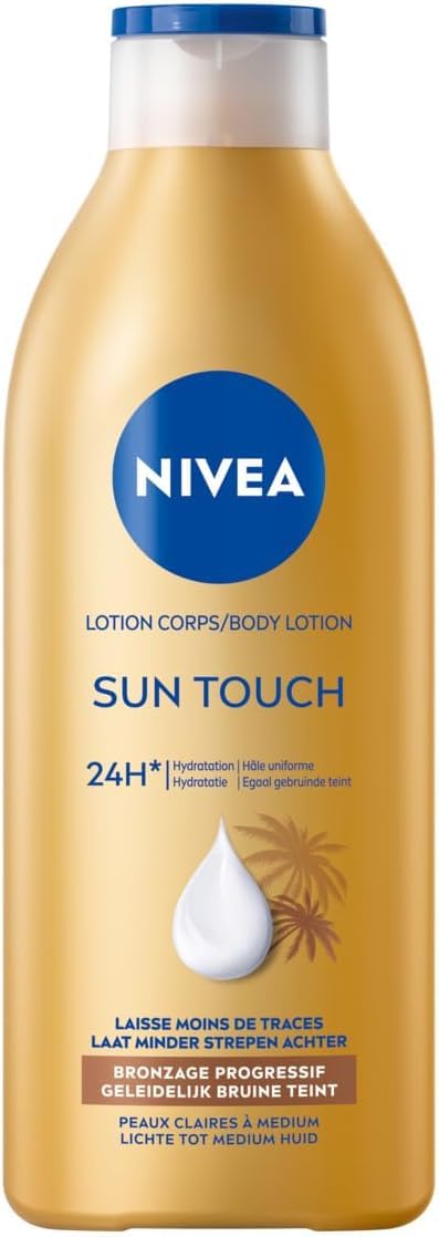 NIVEA Sun Touch Body Lotion - Evenly tanned complexion - Moisturizing Lotion - Ginkgo biloba and grape seed oil - Tanning without Sun - 400 ml Experience a radiant, natural complexion and intensely hydrated skin with the NIVEA Sun Touch Body Lotion. This body lotion has been specially developed to give your skin an even, natural tan, while keeping streaks to a minimum. Thanks to the carefully composed formula, enriched with Gingko extract and grape seed oil, you enjoy intense hydration that lasts up to 72 hours , leaving your skin feeling silky soft. The Bronze Effect body lotion is perfectly tailored to light to medium skin tones and provides a subtle, sunny glow that accentuates your complexion in a natural way. The skin compatibility is dermatologically approved, so you can use the lotion with confidence, even if you have sensitive skin. NIVEA not only cares for your skin, but also for the planet. The new bottle is designed with sustainability in mind, with less plastic than before and made from 50 recycled plastic (without cap). This way you contribute to a better environment while pampering yourself with radiant and hydrated skin. Instrumental evaluation, carried out on 36 women over 2 weeks. INGREDIENTS Aqua, Glycerin, Alcohol Denat., C15-19 Alkane, Isopropyl Palmitate, Paraffinum Liquidum, Cetearyl Alcohol, Dihydroxyacetone, Glyceryl Stearate SE, Ginkgo Biloba Leaf Extract, Vitis Vinifera Seed Oil, Tocopherol, Dimethicone, Sodium Acrylate Acryloyldimethyltaurate Dimethylacrylamide Crosspolymer, Isohexadecane, Sodium Cetearyl Sulfate, Xanthan Gum, Polysorbate 60, Citric Acid, Sorbitan Isostearate, Phenoxyethanol, Linalool, Citronellol, Limonene, Benzyl Alcohol, Geraniol, Parfum SAFETY WARNING For external use only. Avoid contact with the eyes. See moreWith Gingko extract. Leaves the skin feeling soft. 72 hours of hydration. Fewer stripes. Provides an evenly tanned, natural complexion.NIVEA Sun Touch Body Lotion - Egaal Gebruinde teint - Hydraterende Lotion - Ginkgo biloba en druivenpitolie - Bruinen zonder Zon - Lichaamsverzorging - 400 ml NIVEA Sun Touch Body Lotion - Egaal Gebruinde teint - Hydraterende Lotion - Ginkgo biloba en druivenpitolie - Bruinen zonder Zon - 400 ml Ervaar een stralende, natuurlijke teint en een intens gehydrateerde huid met de NIVEA Sun Touch Body Lotion. Deze bodylotion is speciaal ontwikkeld om je huid een gelijkmatige, natuurlijk gebruinde kleur te geven, terwijl strepen tot een minimum worden beperkt. Dankzij de zorgvuldig samengestelde formule, verrijkt met Gingko-extract en druivenpitolie, geniet je van een intense hydratatie die tot wel 72 uur aanhoudt, waardoor je huid zijdezacht aanvoelt. De Bronze Effect bodylotion is perfect afgestemd op lichte tot medium huidtinten en biedt een subtiele, zonnige gloed die je teint accentueert op een natuurlijke manier. De huidverdraagzaamheid is dermatologisch goedgekeurd, zodat je de lotion met een gerust hart kunt gebruiken, zelfs als je een gevoelige huid hebt. NIVEA zorgt niet alleen voor jouw huid, maar ook voor de planeet. De vernieuwde fles is ontworpen met aandacht voor duurzaamheid, met minder plastic dan voorheen en gemaakt van 50 gerecycled plastic (zonder dop). Zo draag je bij aan een beter milieu terwijl je jezelf verwent met een stralende en gehydrateerde huid. Instrumentele evaluatie, uitgevoerd bij 36 vrouwen gedurende 2 weken. INGREDIËNTEN Aqua, Glycerin, Alcohol Denat., C15-19 Alkane, Isopropyl Palmitate, Paraffinum Liquidum, Cetearyl Alcohol, Dihydroxyacetone, Glyceryl Stearate SE, Ginkgo Biloba Leaf Extract, Vitis Vinifera Seed Oil, Tocopherol, Dimethicone, Sodium Acrylate Acryloyldimethyltaurate Dimethylacrylamide Crosspolymer, Isohexadecane, Sodium Cetearyl Sulfate, Xanthan Gum, Polysorbate 60, Citric Acid, Sorbitan Isostearate, Phenoxyethanol, Linalool, Citronellol, Limonene, Benzyl Alcohol, Geraniol, Parfum VEILIGHEIDSWAARSCHUWING Alleen voor extern gebruik. Vermijd contact met de ogen. Meer bekijkenMet Gingko-extract. Laat de huid zacht aanvoelen. 72 uur hydratatie. Minder strepen. Zorgt voor een egaal gebruinde, natuurlijke teint.