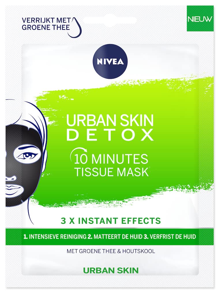 A perfect treat for the busy city skin. Daily stress, the environment and pollution can take its toll on the skin. Take 10 minutes to relax and let the Nivea 10 minute urban skin detox tissue mask detoxify your skin. The tissue mask is enriched with green tea and charcoal for skin that looks healthy and feels clean and fresh. For healthy-looking skin, treat yourself to a mask twice a week. For an extra cooling treatment, place the mask in the refrigerator before use.For normal skin. For healthy-looking skin. Intensive cleaning. Super soft mask and easy to use. 10 minute mask.NIVEA Urban Skin Detox Masker 25 g, 1 stuks Een perfecte traktatie voor de drukke stadshuid. Dagelijkse stress, Het milieu en vervuiling kunnen zijn tol eisen van de huid. Neem 10 minuten de tijd om te ontspannen en laat het Nivea 10 minuten urban skin detox tissuemasker je huid ontgiften. Het tissuemasker is verrijkt met groene thee en houtskool voor een huid die er gezond uitziet en schoon en fris aanvoelt. Voor een gezond uitziende huid, trakteer uzelf twee keer per week op een masker. Voor een extra koelbehandeling plaatst u het masker voor gebruik in de koelkast.Voor de normale huid. Voor een gezond uitziende huid. Intensieve reiniging. Superzacht masker en gemakkelijk te gebruiken. 10 minuten masker.