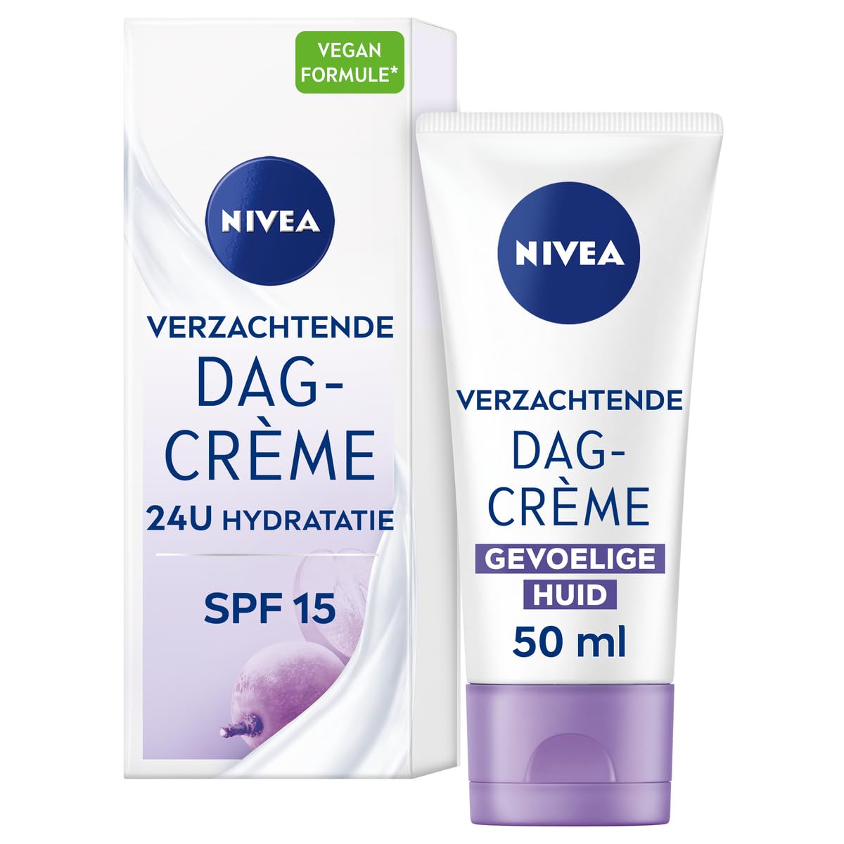 NIVEA Essentials Soothing Day Cream SPF15 (50 ml) hydrates the skin for up to 24 hours and helps to balance the skin's moisture content. The formula, enriched with NIVEA Moisturizing Care Complex, Natural Grape Seed Oil and Licorice Extract, effectively reduces three signs of sensitive skin: redness, tightness and dryness. The day cream offers protection against sunlight with SPF15 and thus prevents damage from UV rays. It is unscented and suitable for sensitive skin. The skin friendliness is dermatologically approved. In addition, it contains no ingredients of animal origin and has the Cyclos-HTP certificate for the Netherlands and Belgium. Perfect for daily use on sensitive skin. INGREDIENTS Aqua, Glycerin, Ethylhexyl Salicylate, C12-15 Alkyl Benzoate, Methylpropanediol, Cetearyl Alcohol, Butyl Methoxydibenzoylmethane, Caprylic Capric Triglyceride, Glyceryl Stearate, Tapioca Starch, Hydroxypropyl Starch Phosphate, Bis-Ethylhexyloxyphenol Methoxyphenyl Triazine, Distarch Phosphate, Glycyrrhiza Inflata Root Extract, Vitis Vinifera Seed Oil, Sodium Stearoyl Glutamate, Butyrospermum Parkii Butter, Ethylhexylglycerin, Hydroxyacetophenone, Xanthan Gum, Phenylbenzimidazole Sulfonic Acid, Trisodium EDTA, Sodium Chloride, Sodium Hydroxide, Phenoxyethanol SAFETY WARNING For external use only. Avoid contact with the eyes. See moreUnscented. Supports the skin's own resistance to external irritations. Helps to balance the skin's moisture content. Effectively reduces the 3 signs of sensitive skin. Intensively hydrates the skin for up to 24 hours.NIVEA Essentials Verzachtende Dagcrème SPF15 - gevoelige huid - Hydraterende Gezichtscrème - Gezichtsverzorging - 50ml NIVEA Essentials Verzachtende Dagcrème SPF15 (50 ml) hydrateert de huid tot 24 uur en helpt het huideigen vochtgehalte in balans te brengen. De formule, verrijkt met NIVEA Hydraterend Care Complex, Natuurlijke Druivenpitolie en Zoethout-extract, vermindert effectief drie tekenen van een gevoelige huid: roodheid, trekkerigheid en droogheid. De dagcrème biedt bescherming tegen zonlicht met SPF15 en voorkomt zo schade door UV-stralen. Hij is ongeparfumeerd en geschikt voor de gevoelige huid. De huidvriendelijkheid is dermatologisch goedgekeurd. Daarnaast bevat het geen ingrediënten van dierlijke oorsprong en heeft het het Cyclos-HTP certificaat voor Nederland en België. Perfect voor dagelijks gebruik op een gevoelige huid. INGREDIËNTEN Aqua, Glycerin, Ethylhexyl Salicylate, C12-15 Alkyl Benzoate, Methylpropanediol, Cetearyl Alcohol, Butyl Methoxydibenzoylmethane, Caprylic Capric Triglyceride, Glyceryl Stearate, Tapioca Starch, Hydroxypropyl Starch Phosphate, Bis-Ethylhexyloxyphenol Methoxyphenyl Triazine, Distarch Phosphate, Glycyrrhiza Inflata Root Extract, Vitis Vinifera Seed Oil, Sodium Stearoyl Glutamate, Butyrospermum Parkii Butter, Ethylhexylglycerin, Hydroxyacetophenone, Xanthan Gum, Phenylbenzimidazole Sulfonic Acid, Trisodium EDTA, Sodium Chloride, Sodium Hydroxide, Phenoxyethanol VEILIGHEIDSWAARSCHUWING Alleen voor extern gebruik. Vermijd contact met de ogen. Meer bekijkenOngeparfurmeerd. Ondersteunt de huideigen weerstand tegen irritaties van buitenaf. Helpt het huideigen vochtgehalte in balans te brengen. Vermindert effectief de 3 tekenen van een gevoelige huid. Hydrateert de huid tot 24 uur intensief.