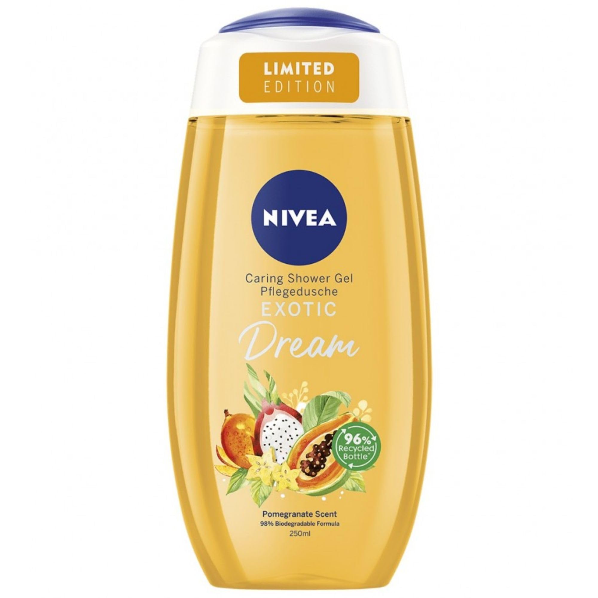 Nivea Exotic Dream Pomegranate Scent Care shower gel with an exotic garnet scent 250 ml soft foam for hydrated and saturated skin. In balance with the skin's natural microbiome. Biodegradable formula 96 - according to OECD or equivalent methods. Formula without microplastics - according to UNEP. The bottle is made from 96 recycled material. Deep Cleansing: Give your skin what it needs with this hydrating body wash. With a skin-neutral pH value that is suitable for the skin. Dermatologically confirmed skin compatibility. NIVEA Exotic Dream Pomegranate Scent Care shower gel with an exotic garnet scent 250 ml soft foam for hydrated and saturated skin. In balance with the skin's natural microbiome. Biodegradable formula 96 - according to OECD or equivalent methods. Formula without microplastics - according to UNEP. The bottle is made from 96 recycled material. Deep Cleansing: Give your skin what it needs with this hydrating body wash. With a skin-neutral pH value that is suitable for the skin. Dermatologically confirmed skin compatibility.4 x 250 ml (Pack of 4). Biodegradable formula: 96 . Deep Cleansing. Soft foam for hydrated and saturated skin. With an exotic garnet scent.NIVEA Douchegel 250 ml Exotic Dream (Pack van 4) Geparfumeerd Met Tropical Fruits, voedt de huid voorzichtig met een 98 biologisch afbreekbare formule, bevordert huidverzorging en milieuduurzaamheid Nivea Exotic Dream Pomegranate Scent Care douchegel met een exotische granaatgeur 250 ml zacht schuim voor de gehydrateerde en verzadigde huid. In balans met het natuurlijke microbioom van de huid. Biologisch afbreekbare formule 96 - volgens OESO of equivalente methoden. Formule zonder microplastics - volgens UNEP. De fles is gemaakt van 96 gerecycled materiaal. Diepe reiniging: geef je huid wat het nodig heeft met deze hydraterende was van het lichaam. Met een huidneutrale pH-waarde die geschikt is voor de huid. Dermatologisch bevestigde huidcompatibiliteit. NIVEA Exotic Dream Pomegranate Scent Care douchegel met een exotische granaatgeur 250 ml zacht schuim voor de gehydrateerde en verzadigde huid. In balans met het natuurlijke microbioom van de huid. Biologisch afbreekbare formule 96 - volgens OESO of equivalente methoden. Formule zonder microplastics - volgens UNEP. De fles is gemaakt van 96 gerecycled materiaal. Diepe reiniging: geef je huid wat het nodig heeft met deze hydraterende was van het lichaam. Met een huidneutrale pH-waarde die geschikt is voor de huid. Dermatologisch bevestigde huidcompatibiliteit.4 x 250 ml (Pack van 4). Bioafbreekbare formule: 96 . Deep Cleansing. Zacht schuim voor de gehydrateerde en verzadigde huid. Met een exotische granaatgeur.