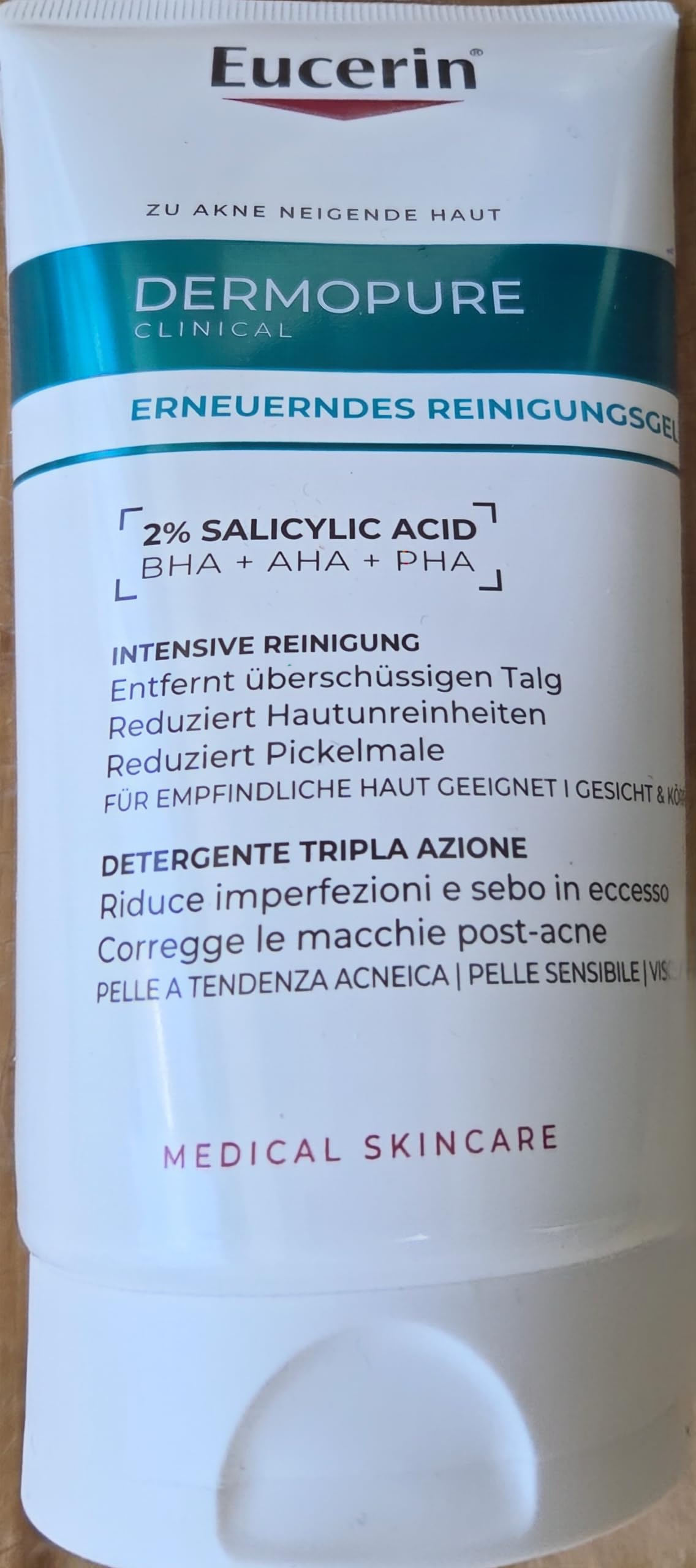 Eucerin DermoPure Clinical Triple Action Cleaner – the specialist for oily and acne-prone skin Acne affects the daily lives of a huge percentage of the population: up to 95 percent of young people and 40 percent of adults. After dealing with blemishes, many people are still dealing with blemishes after acne, which can last several years or even ten years. The Eucerin DermoPure Clinical line has been specially developed to combat the main causes of impure and acne-prone skin. Eucerin DermoPure Clinical Triple Action Cleaner works on three fronts simultaneously: Anti-impurities of the skin: with 2 salicylic acid removes clogged pores and reduces impurities and prevents recurrence of contaminants. Anti-spots: Thanks to the peeling complex of AHA BHA PHA, it promotes cell renewal by removing dead skin and reducing spots after acne. Anti-shine: thoroughly cleanses and removes excess sebum, impurities and make-up residue. The result? Oily, impure and acne-prone skin looks soft, fresh and clean and post-acne spots are visibly reduced. Non-comedogenic and with a matte finish, the facial cleanser for women and men can be used in combination with the drug treatment for acne, during pregnancy and for sensitive skin. Product benefits: Cleanser against stains, impurities and shine. For face and body. Recommended by dermatologists for acne-prone skin. Suitable from 12 years. With 2 salicylic acid and dermo acids AHA BHA PHA Non-comedogenic. 96 confirmed: reduces blemishes and blemishes after acne Dermatologically tested. Product use test on 100 people for 4 weeks. SAFETY WARNING For external use only. Avoid contact with the eyes.Apply the facial cleanser for acne in the morning and evening. Massage into damp facial skin and rinse. For optimal results, use the Triple Action serum and the protective fluid SPF 30 from the Eucerin DermoPure Clinical series. The Eucerin DermoPure Clinical cleansing foam for face and body deeply cleanses effectively for an anti-shine effect, reduces impurities and excess oil and stimulates cell renewal by reducing acne spots.Eucerin DermoPure Clinical Gezichtsreiniger, drievoudige werking, 150 ml, gezichtsreiniger tegen vlekken, onvolkomenheden en glans met 2 salicylzuur voor vettige en acnegevoelige huid Fris 150 ml (1er Pack) Eucerin DermoPure Clinical Triple Action Cleaner – de specialist voor vettige en acne-gevoelige huid Acne beïnvloedt het dagelijks leven van een enorm percentage van de bevolking: tot 95 procent van de jongeren en 40 procent van de volwassenen. Na het omgaan met onvolkomenheden zijn veel mensen nog steeds bezig met het bestrijden van vlekken na acne, die meerdere jaren of zelfs tien jaar kunnen duren. De Eucerin DermoPure Clinical lijn is speciaal ontwikkeld om de belangrijkste oorzaken van onzuivere en acne gevoelige huid te bestrijden. Eucerin DermoPure Clinical Triple Action Cleaner werkt op drie fronten tegelijkertijd: Anti-onzuiverheden van de huid: met 2 salicylzuur verwijdert verstopte poriën en vermindert onzuiverheden en voorkomt herhaling van verontreinigingen. Anti-vlekken: dankzij het peelingcomplex van AHA BHA PHA bevordert het celvernieuwing door dode huid te verwijderen en vlekken na acne te verminderen. Anti-glans: reinigt grondig en verwijdert overtollig talg, onzuiverheden en make-upresten. Het resultaat? Vettige, onzuivere en acnegevoelige huid ziet er zacht, fris en schoon uit en post-acne vlekken worden zichtbaar verminderd. Niet-comedogeen en met matte afwerking kan de gezichtsreiniger voor dames en heren in combinatie met de medicamenteuze behandeling bij acne, tijdens de zwangerschap en bij gevoelige huid worden gebruikt. Productvoordelen: Reiniger tegen vlekken, onzuiverheden en glans. Voor gezicht en lichaam. Aanbevolen door dermatologen voor acne gevoelige huid. Geschikt vanaf 12 jaar. Met 2 salicylzuur en dermozuren AHA BHA PHA Niet-comedogeen. 96 bevestigd: vermindert onvolkomenheden en vlekken na acne Dermatologisch getest. Productgebruikstest bij 100 personen gedurende 4 weken. VEILIGHEIDSWAARSCHUWING Alleen voor uitwendig gebruik. Vermijd contact met de ogen.Breng de gezichtsreiniger voor acne 's ochtends en 's avonds aan. In de vochtige gezichtshuid inmasseren en uitspoelen. Voor optimale resultaten gebruik je het Triple Action-serum en de beschermende vloeistof SPF 30 van de Eucerin DermoPure Clinical serie. Het Eucerin DermoPure Clinical reinigingsschuim voor gezicht en lichaam reinigt diep effectief voor een anti-glans-effect, vermindert onzuiverheden en overtollige olie en stimuleert de celvernieuwing door het verminderen van acne-vlekken.