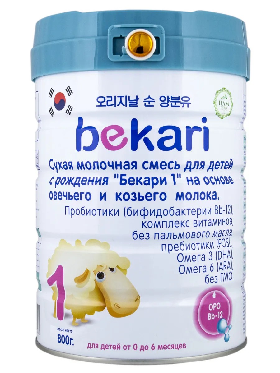 Бекари 1сухая молочная смесь для детей с рождения на основе овечьего и козьего молока.Сочетает в себе ценные свойства овечьего и козьего молока. Не содержит коровьего молока. Содержит пробиотики от всемирно-известного бренда CHR HANSEN Дания.Пищевые волокна FOS, которые помогают обеспечить комфортное пищеварение, способствуют нормализации микрофлоры кишечника и регулярному мягкому стулу.Содержит жиры с уникальной OPO структурой аналогичные жирам материнского молока и важные жирные кислоты Омега 3 DHA и Омега 6 ARA.Про- и пребиотики способствуют развитию здоровой микрофлоры кишечника и укрепляют иммунитет ребёнка,и вместе с уникальными свойствами овечьего и козьего молока помогают снижать риск возникновения аллергии и инфекций. Витамин D, фосфор и кальций обеспечивают рост и крепость зубов и костей. Белки и жиры смеси,приближенные по составу к белкам и жирам грудного молока, а также сбалансированный комплекс витаминов и минералов обеспечивают гармоничный рост и развитие ребёнка.