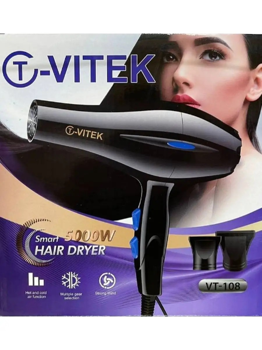 A versatile and stylish hair dryer with ionization for perfect hair and styling. This additional feature allows for proper hair care. Its 5000W power allows you to dry and style hair of any length and thickness in 5-7 minutes. Three temperature settings and two airflow speeds are available. It comes with two concentrator attachments for targeted styling. Tourmaline ionization protects strands, maintaining moisture balance and preventing color fading. This feature reduces static buildup, making styling easier. The 2-meter cord and convenient hanging hook make storage easy. With the T-Vitek hair dryer, you'll always look great and keep your hair well-hydrated and healthy.