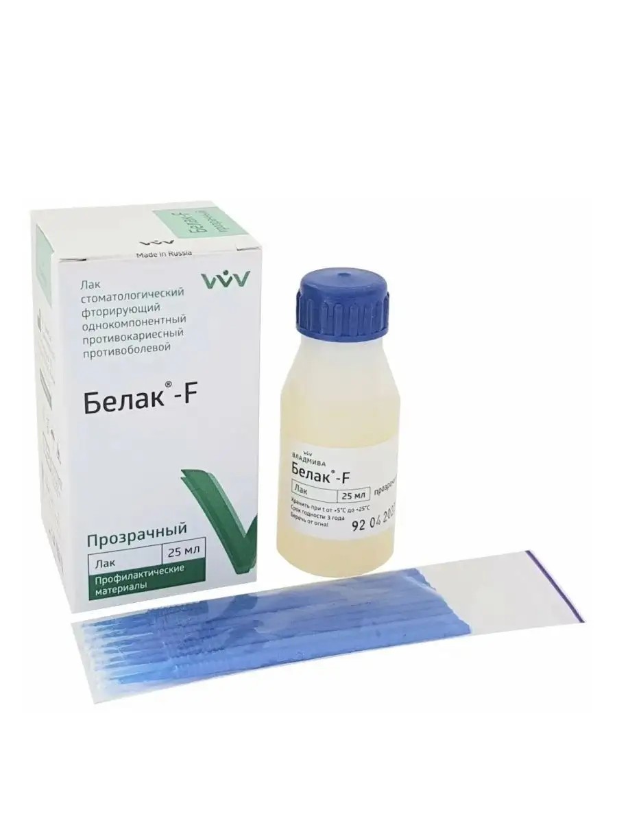 Белак F белый — фторирующий лак на основе фторида калия. Ионы фтора, содержащиеся в препарате, не допускают развития кариеса, укрепляют зубную эмаль и снижают ее проницаемость.