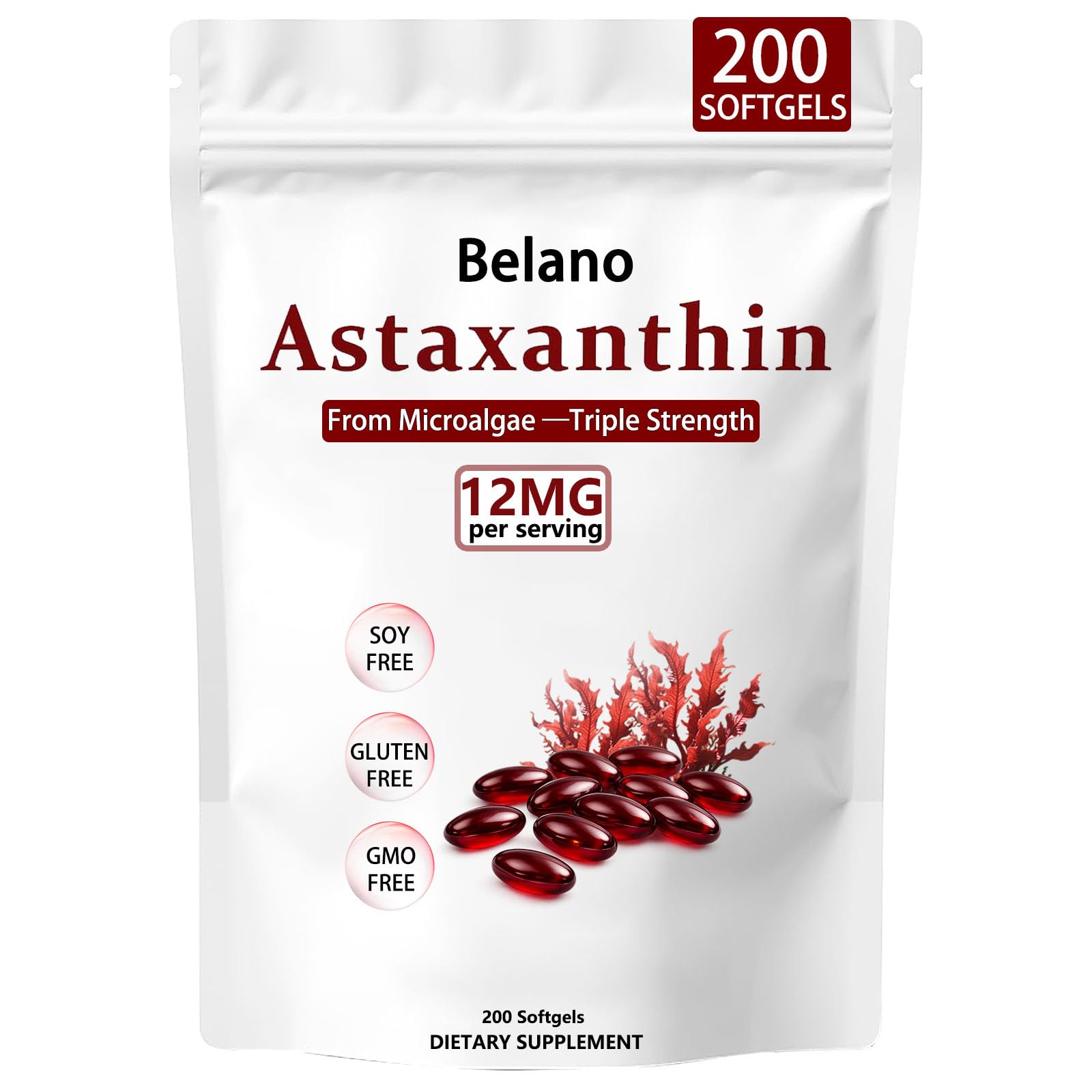 Belano Astaxanthin 12 mg 200 Softgels Natural Astaxanthin Antioxidant Supplement Clean Formula Non-GMO Verified & Gluten Free