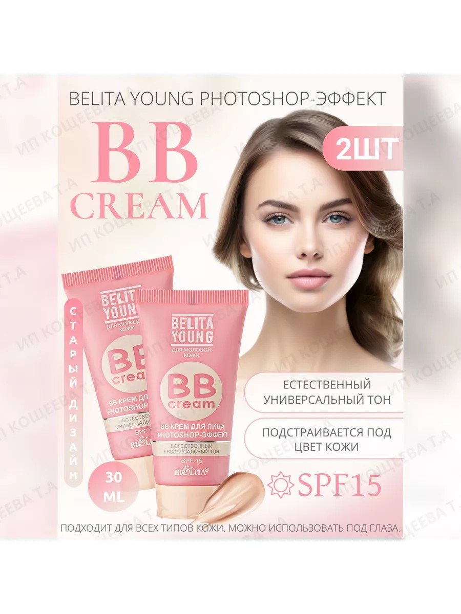 BB Крем для лица Belita Young PHOTOSHOP-ЭФФЕКТ БЕЛИТА 2 штуки. Представлен как в новом, так и в старом дизайне! (Уважаемые покупатели! При покупке BB крема просим Вас обратить внимание,что в новом дизайне все крема идут БЕЗ защитной мембраны!) BB-крем (Beauty Balm, бальзам красоты) Идеален для молодой кожи, подстраивается под цвет кожи, мгновенно выравнивает тон, визуально скрывает недостатки кожи и увлажняет ее, обладает УФ-защитой, обеспечивает умеренный тонирующий эффект. Экстракт австралийских ягод наполняет кожу витаминами и минералами. Подходит для всех типов кожи. Можно использовать под глаза. Применение: нанесите BB крем на предварительно очищенную кожу лица и шеи. Мягко распределите по массажным линиям.BB-крем 2шт, по 30мл.