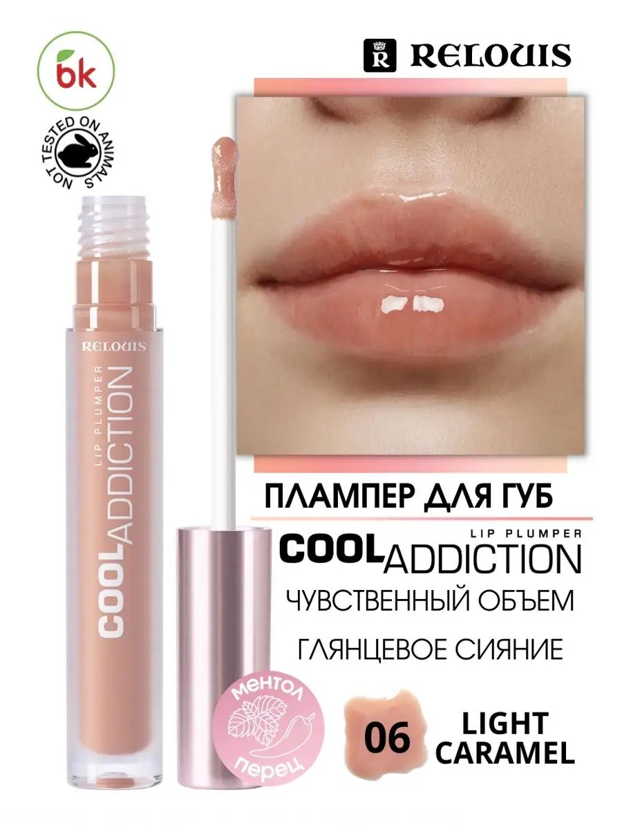 Плампер для губ Cool Addiction Lip Plumper Relouis от белорусского бренда декоративной косметики – секрет притягательности ваших губ! Плотная нелипкая текстура блеска создает ощущение гладких, увлажненных, напитанных губ для сочного и соблазнительного результата. Ментол усиливает приток крови к нежной коже губ, придавая им чувственный объем. Экстракт красного перца активизирует микроциркуляцию крови, разглаживает кожу губ, придает им более яркий насыщенный оттенок. Масло оливы содержит природные антиоксиданты, защищает кожу от преждевременного старения, восстанавливает ее гладкость и служит барьером для УФ излучений. Масло подсолнечника оказывает смягчающее и регенерирующее действие, разглаживает мелкие морщинки, питает и увлажняет нежную кожу губ. Натуральные нежные оттенки станут изюминкой любого макияжа от ежедневного нюдового до яркого гламурного образа.