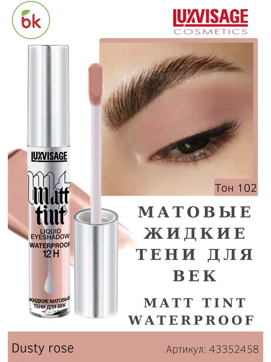 Тени для век MATT TINT WATERPROOF 12H от белорусского бренда декоративной косметики Люкс-Визаж. Жидкие тени легко наносятся, равномерно ложатся, быстро высыхают и фиксируются на коже, приобретая бархатный матовый финиш. Обладают высокой кроющей способностью и создают плотное и одновременно невесомое покрытие с первого нанесения. Легко и плавно растушевываются как кистью, так и кончиками пальцев. Комфортная флюидная текстура продукта не ощущается на веках в течение дня, не сушит и не стягивает кожу. Тени матовые устойчивы к воздействию воды, сохраняют стойкость и безупречный вид макияжа на протяжении 12 часов, даже на нависших веках и склонной к жирности коже. Не тускнеют, не скатываются, не отпечатываются, не размазываются, не трескаются. Удобный плоский мягкий аппликатор обеспечивает комфортное и точное нанесение оптимального количества теней точечно или на всю поверхность века. Палитра из 10 нежных естественных оттенков подчеркнет выразительность глаз и придаст взгляду свежести и глубины. Нанесите тени на веки при помощи аппликатора и равномерно распределите подушечками пальцев либо плоской кистью с искусственным ворсом. При необходимости растушуйте границы нанесения пушистой кистью с искусственным ворсом, пока текстура не высохла. Продукт можно использовать в качестве базы под компактные тени, чтобы усилить интенсивность цвета и улучшить стойкость макияжа.