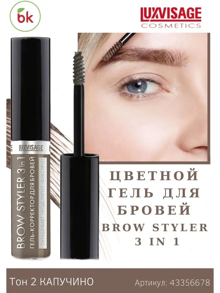 Цветной гель-корректор для бровей с микрофиброй Brow Styler 3 in 1от белорусского бренда декоративной косметики Luxvisage (Люксвизаж). Брови - важнейшая часть нашего лица. Они являются частью уникального образа каждого из нас, привлекают внимание и подчёркивают нашу красоту. Оттеночный гель придает бровям выразительность и естественный ухоженный вид, обеспечивая фиксацию волосков. Придает бровям дополнительный объем и густоту, заполняет пробелы. Профессиональная щеточка-стилист тщательно прокрашивает волоски и моделирует форму бровей, а особые микроволокна в составе геля придают бровям объем и густоту. Стойкая гелевая текстура отлично фиксирует их и сохраняет форму, при этом не склеивает и не создает эффект «мокрых волосков». Гель представлен в 4 оттенках, подходящих к любому натуральных цвету волос. С помощью щеточки аккуратно прокрасьте брови гелем по направлению роста волосков и придайте желаемую форму. С гелем-корректором BROW STYLER ваши брови ухоженные, четкие и естественные!